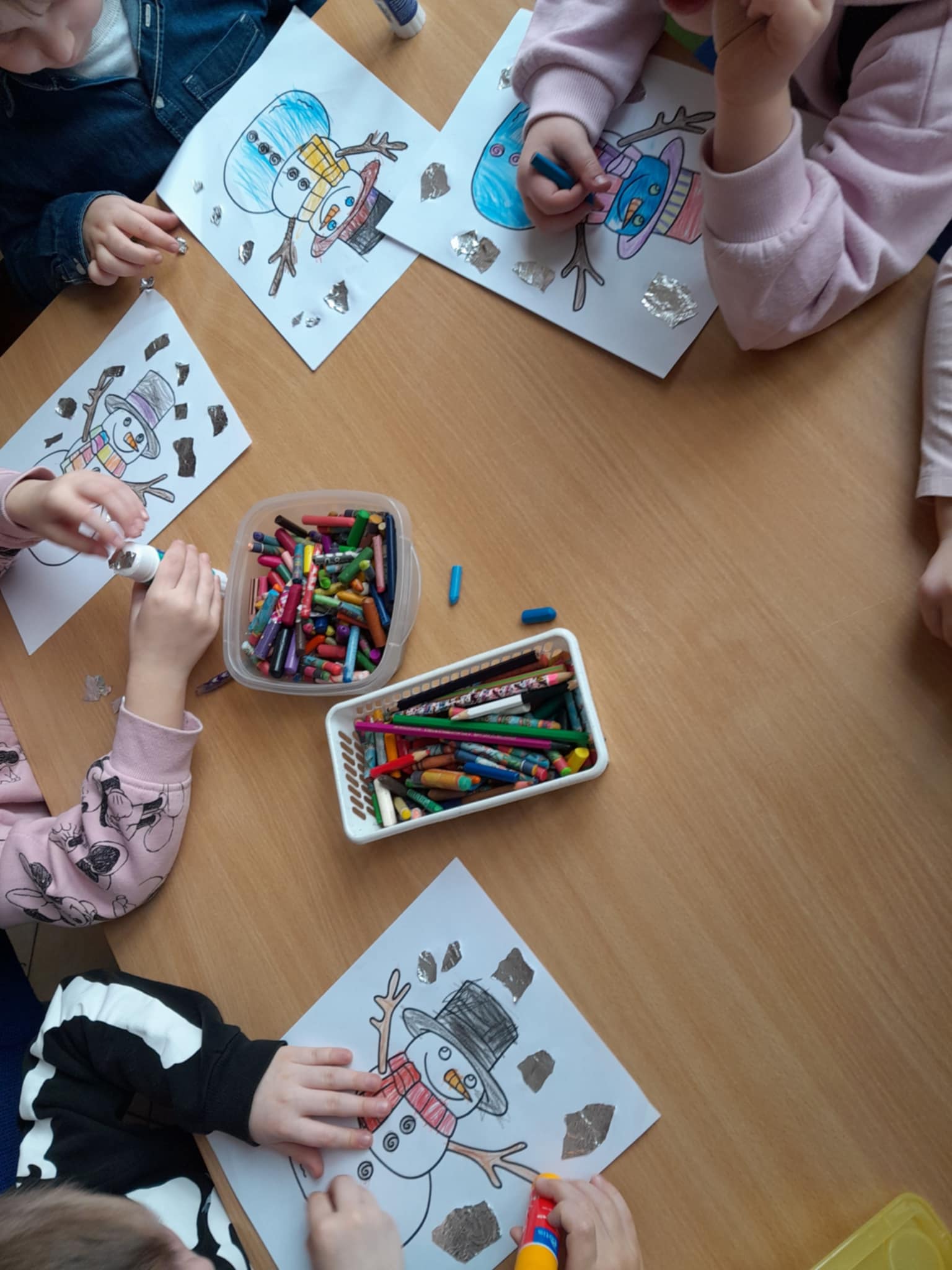 Pięciolatki wykonały bałwanka, na którego spadały płatki śniegu ze sreberka.