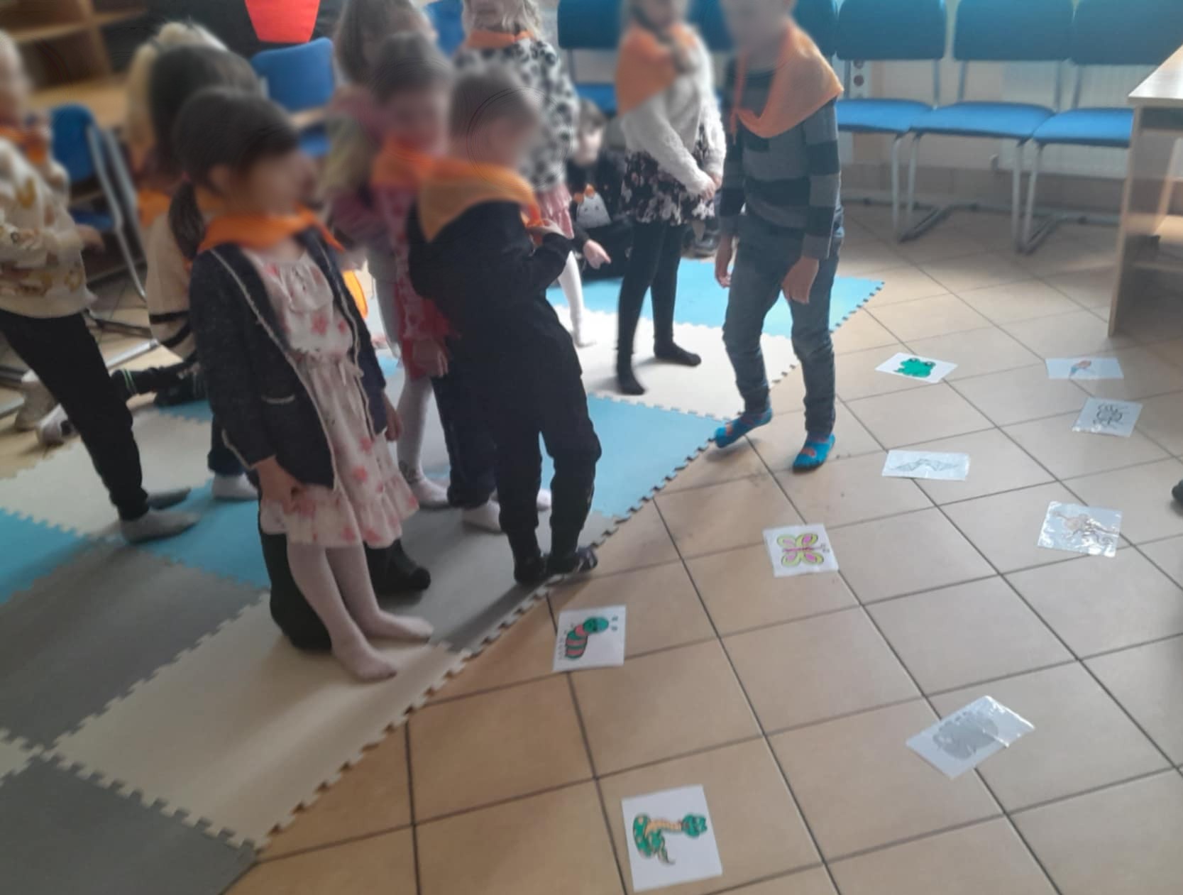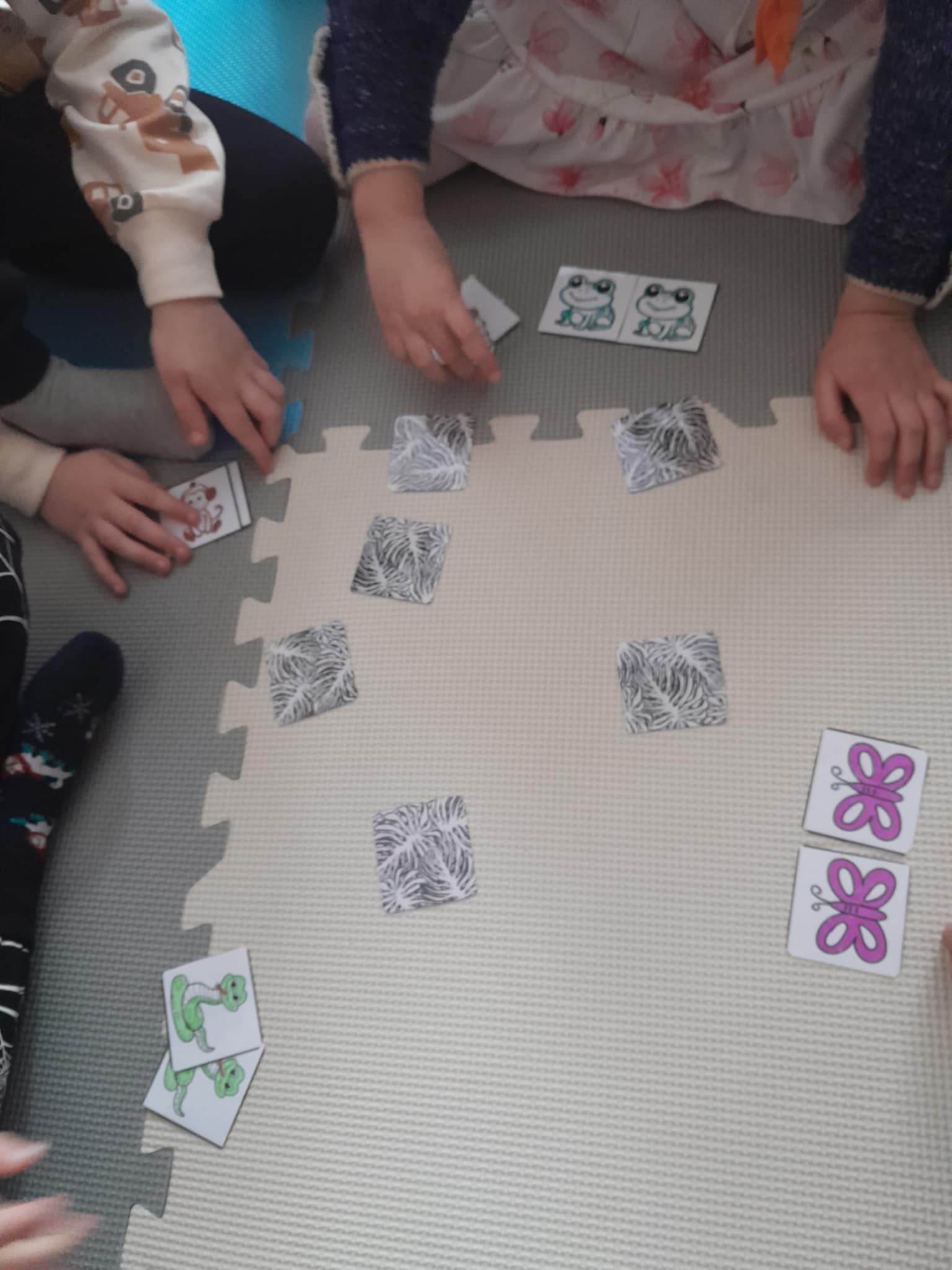 Maluchy pod kierunkiem Pani lektorki, Karoliny, bawiły się w memo, szukały obrazków ze zwierzętami, które wymieniała prowadząca zajęcia. Zgłaszały się, gdy nauczycielka wymawiała nazwę zwierzątka, którego obrazek posiadały. Szukały par: małe zwierzątko (dziecko) i dorosłe zwierzę (jego rodzic), np. gąsienica – motyl. Śpiewały również piosenkę o mieszkańcach dżungli.