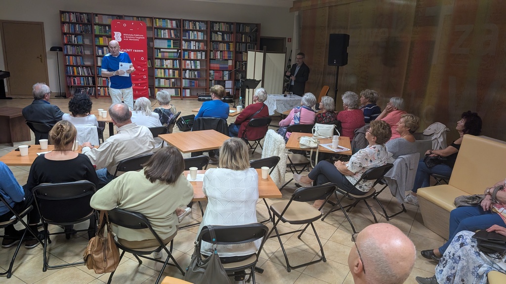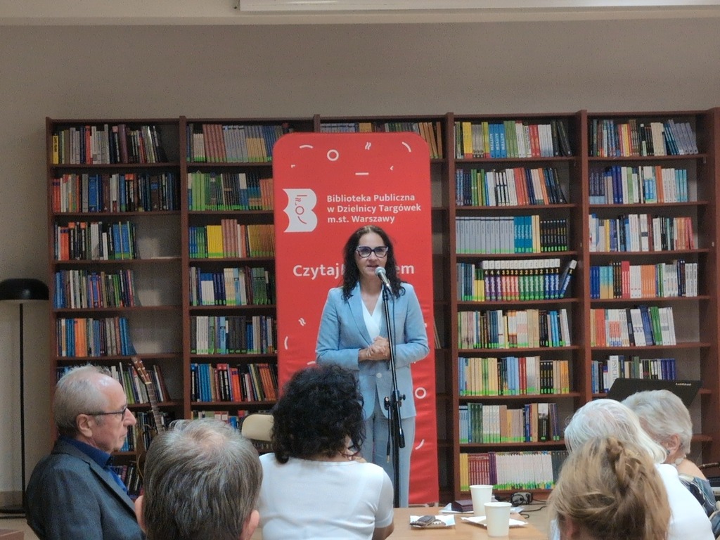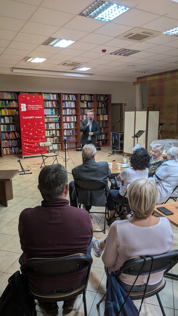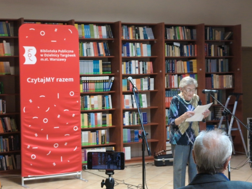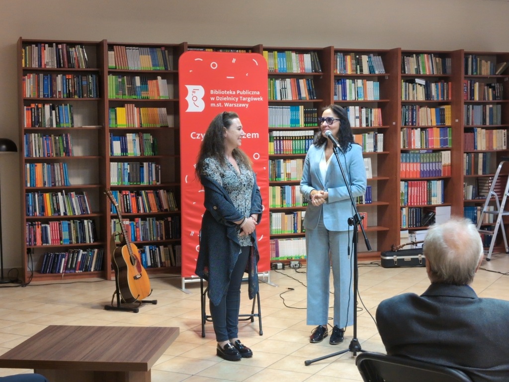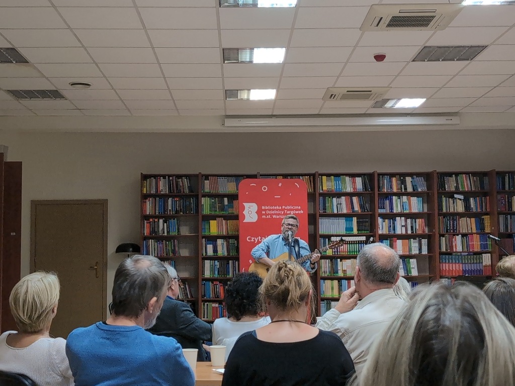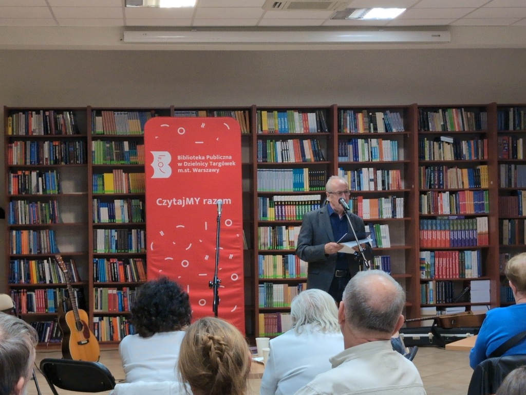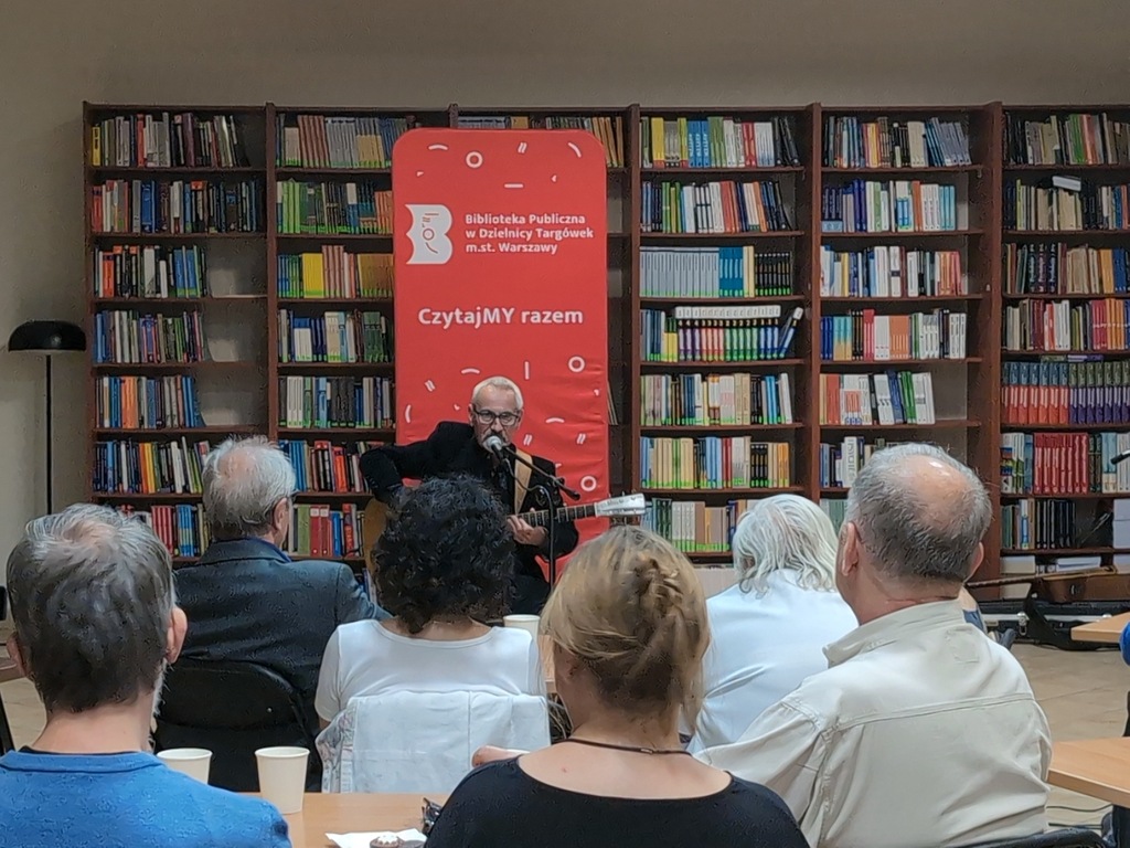 Spotkanie rozpoczęła Zastępczyni Dyrektora Biblioteki na Targówku Grażyna Strzelczak-Batkowska, witając gości i wprowadzając w wyjątkową atmosferę wydarzenia. Następnie głos zabrał gospodarz cyklu, Jacek Gutry, który – jak zawsze – zadbał o artystyczny nastrój. Tym razem wykonał swoją „Balladę ponadwczasową”, a następnie piosenkę o naszej Metrotece, zaskarbiając sobie serdeczność i uśmiechy słuchaczy.