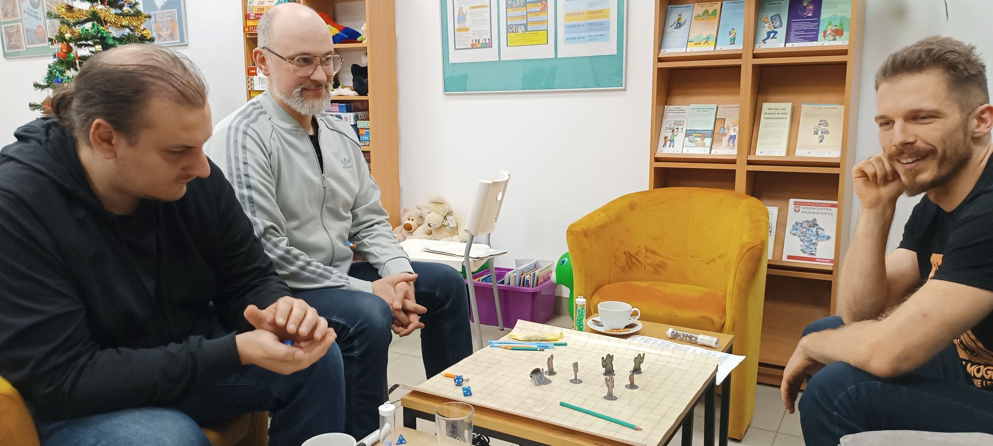 19 grudnia w Wypożyczalni dla Dorosłych i Młodzieży nr 64 przy ul. Radzymińskiej 121 odbyła się kolejna sesja RPG w systemie Dungeons & Dragons. Grudniowe spotkanie rozpoczęliśmy od świątecznych życzeń oraz wręczenia drobnych upominków od biblioteki. Była to również pierwsza sesja z oprawą muzyczną, która pomagała wprowadzić graczy w klimat otaczającego ich świata.