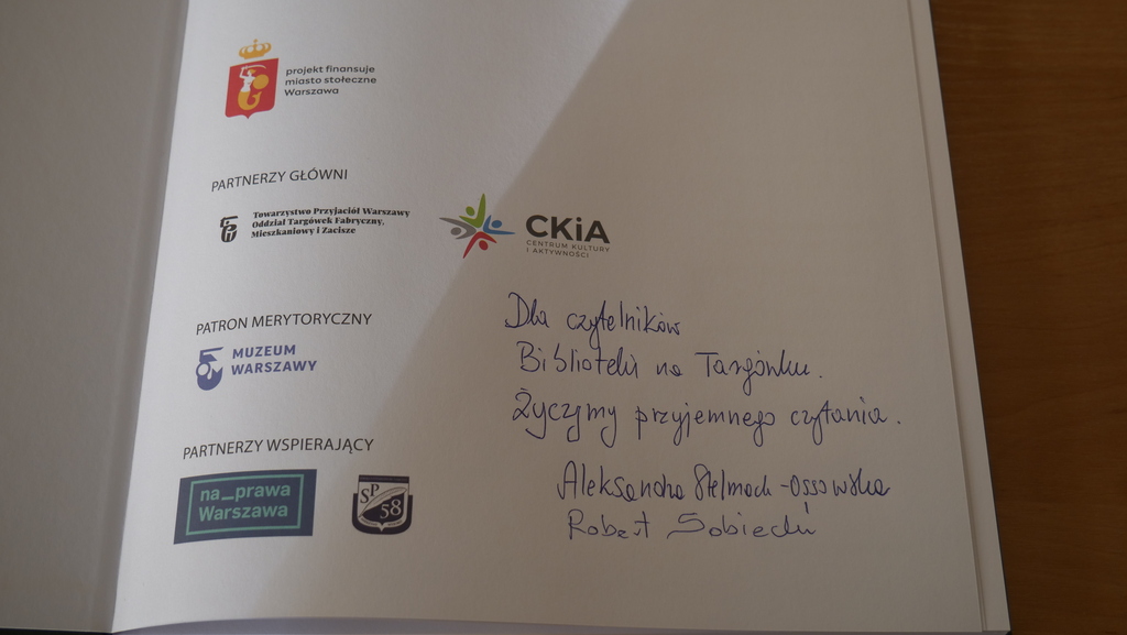 Serdecznie dziękujemy za wspaniałą książkę, którą przekazali nam: Dyrektor Centrum Kultury i Aktywności w Dzielnicy Targówek Agnieszka Szmulewicz oraz Aleksandra Stelmach-Ossowska i Robert Sobiecki (Towarzystwo Przyjaciół Warszawy Oddział Targówek Fabryczny Mieszkaniowy Zacisze).