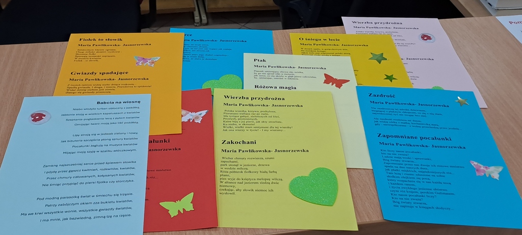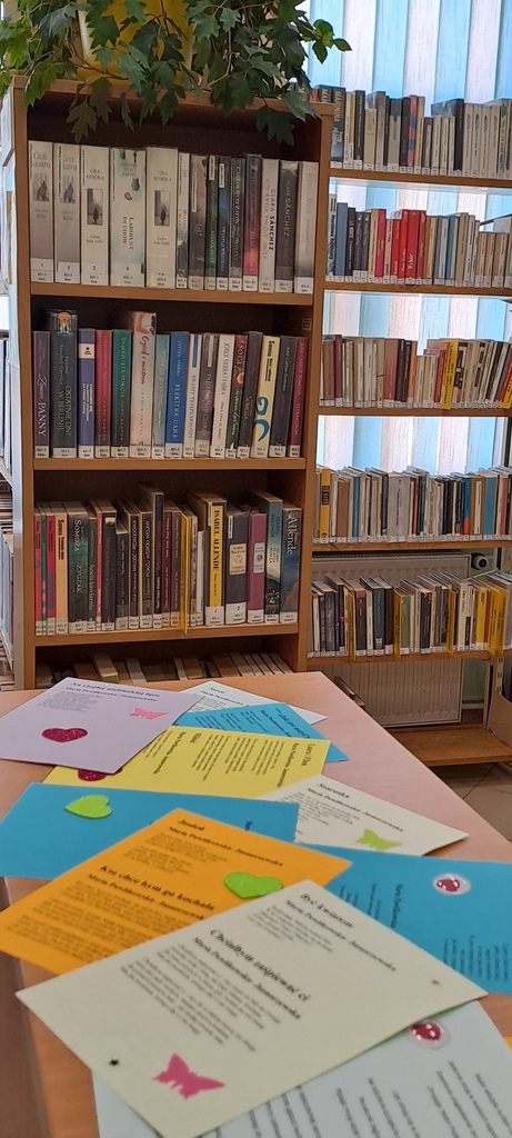 Najpierw było ambitnie – 21 marca, Światowy Dzień Poezji. Każdy odwiedzający zabierał ze sobą oprócz książek także kolorową karteczkę z wierszem Marii Pawlikowskiej-Jasnorzewskiej, patronki roku 2025.
