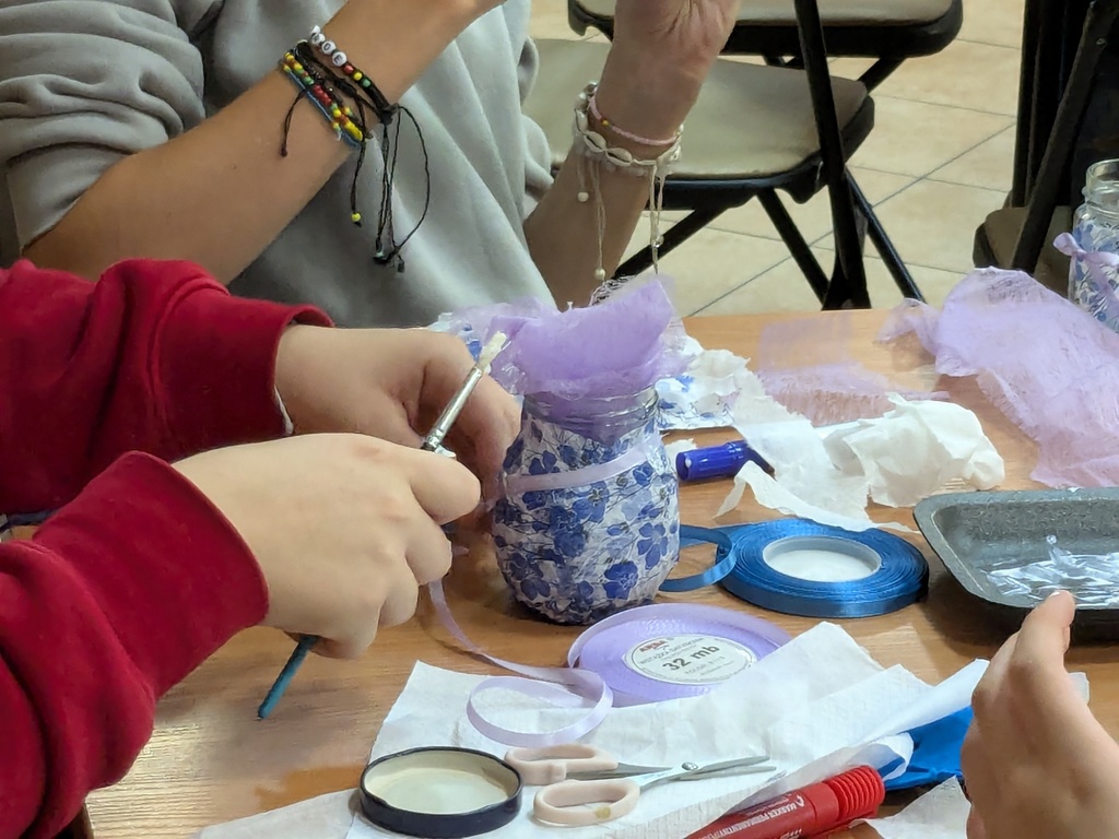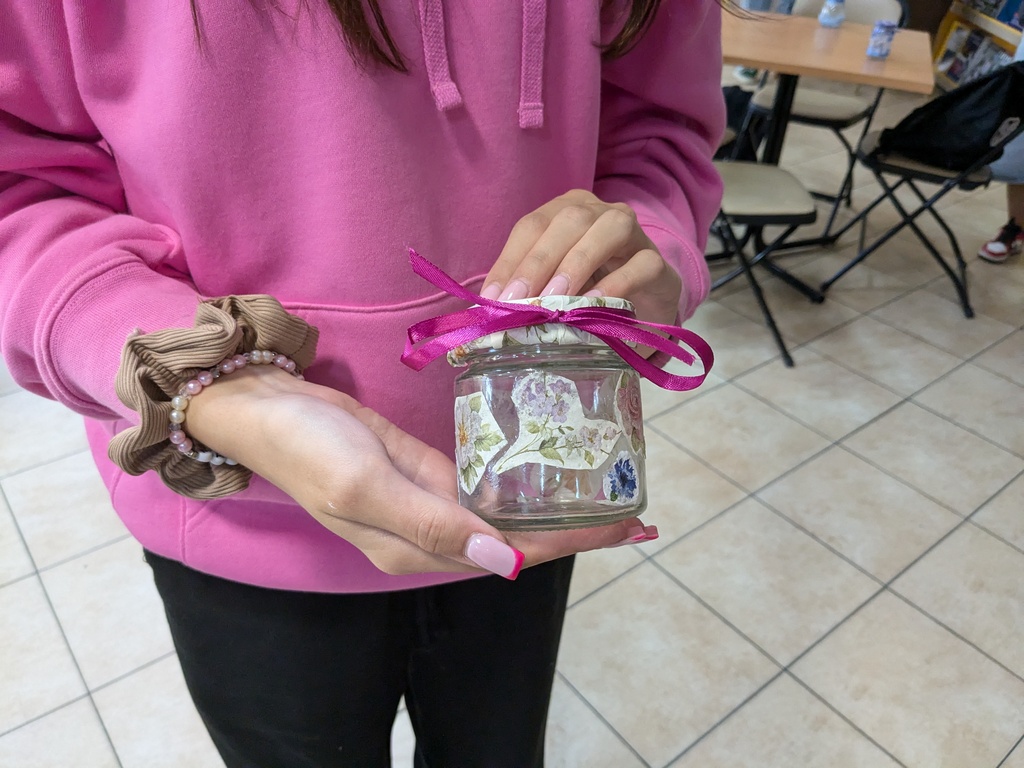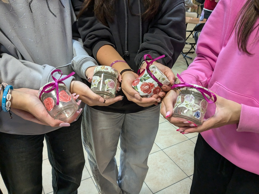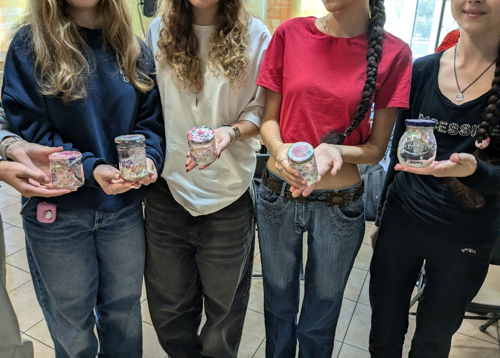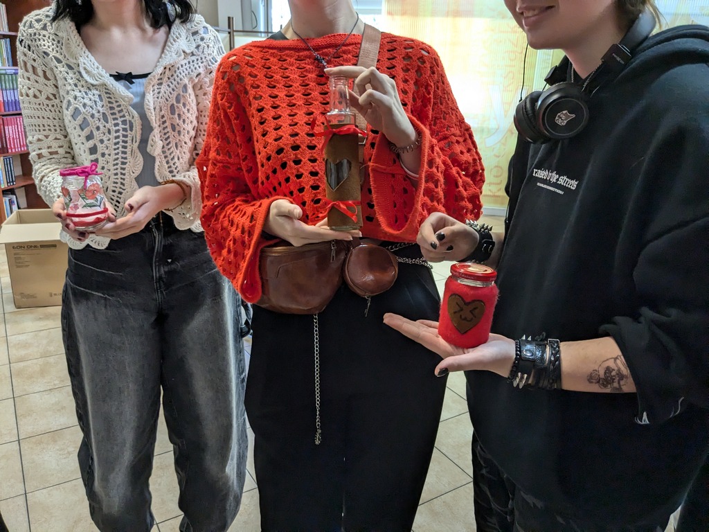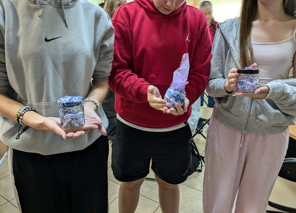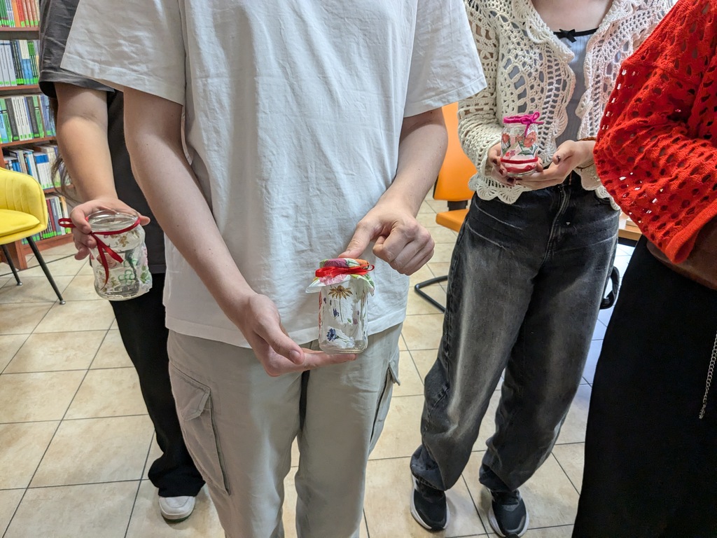 Młodzież miała za zadanie wykonać własny słoik z okienkiem na skarby, który przypominałby o tym, że warto wystawić nos za swój płot i poznawać nieznane. Do dyspozycji uczestników były mazaki permanentne do rysowania po szkle, serwetki, pędzelki, klej, filc, tiul i kolorowe tasiemki – można więc było połączyć wiele technik, by stworzyć niepowtarzalną rzecz z recyklingowego słoiczka po dżemie. Przy okazji niektórzy nabrali apetytu nie tylko na podróże, ale również na… dżem truskawkowy i z czarnej porzeczki.