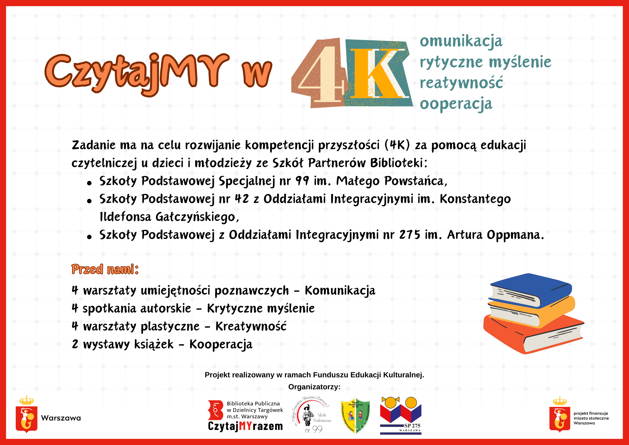 Zadanie miało na celu rozwijanie kompetencji przyszłości (4K) za pomocą edukacji czytelniczej u dzieci i młodzieży ze Szkoły Podstawowej Specjalnej nr 99 im. Małego Powstańca, Szkoły Podstawowej nr 42 z Oddziałami Integracyjnymi im. Konstantego Ildefonsa Gałczyńskiego oraz Szkoły Podstawowej z Oddziałami Integracyjnymi nr 275 im. Artura Oppmana.