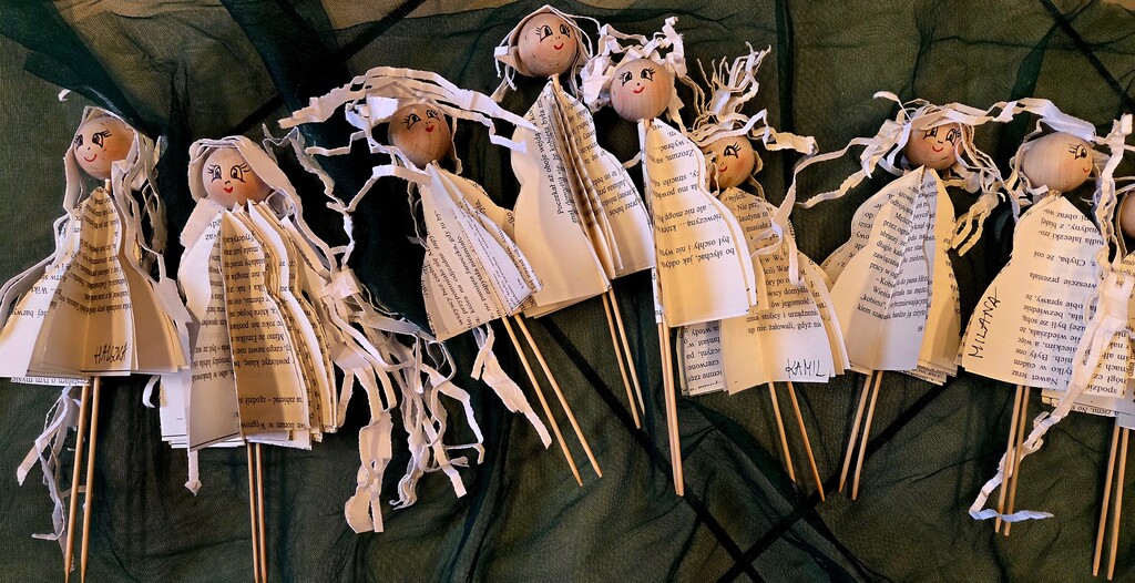 W części warsztatowej powstały rozmaite „zaczytane” dzieła: breloczki-miniksiążeczki, papierowe róże, książkowe jeże oraz kukiełki–królewny z patyczków i kartek pochodzących ze starych książek.