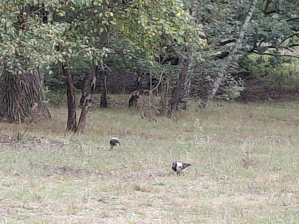 Na skraju lasu, w pobliżu polany dostrzegliśmy wronę siwą, która głośno krakała. Z uwagi na fakt, że wrony te mają tylko szary brzuch i głowę (pozostałe części ciała są czarne) często mylone są z krukami. Są to bardzo inteligentne ptaki, które potrafią posługiwać się narzędziami, rozbijać orzechy o jezdnię. Są troskliwymi rodzicami, walecznie bronią gniazd.