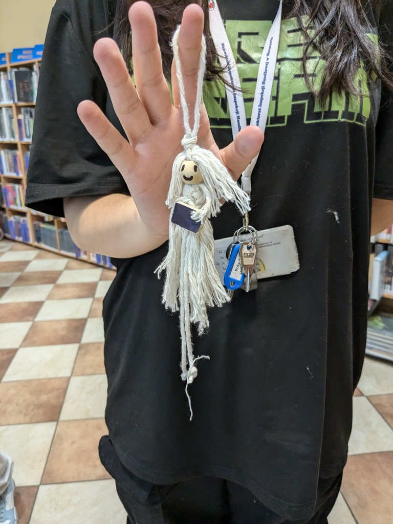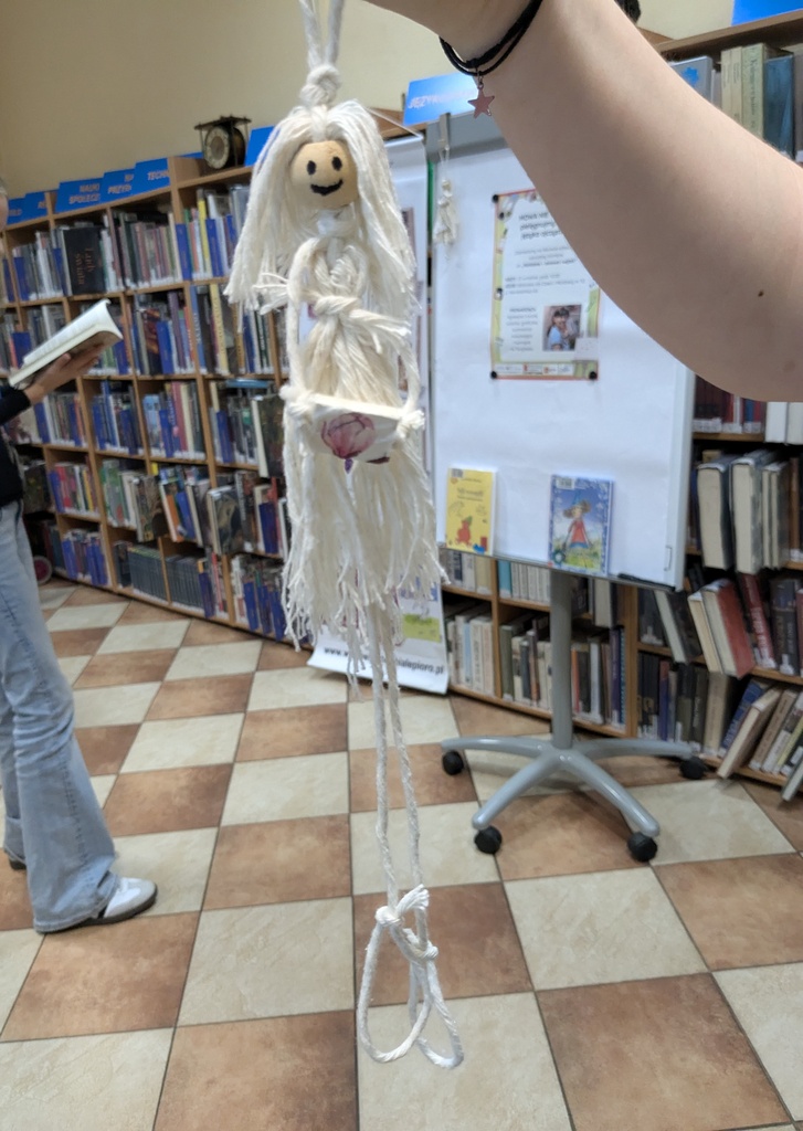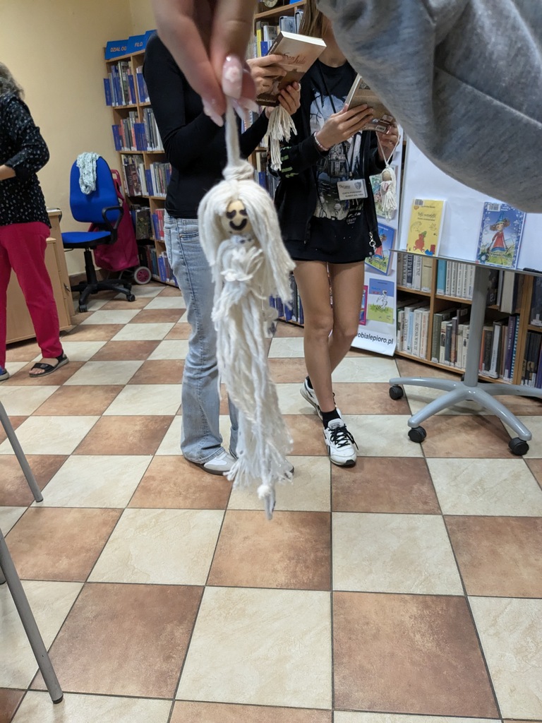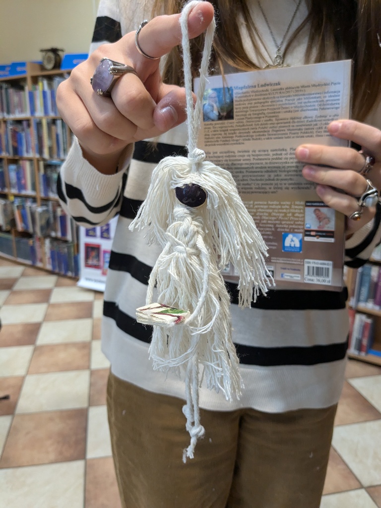 W części plastycznej poprzeczka została postawiona wysoko, gdyż uczestnicy mieli za zadanie stworzyć własną Książniczkę – laleczkę ze sznurka z książką w maleńkich dłoniach. Każdy otrzymał koralik (na głowę) i tyle sznurka, ile chciał, po czym wszyscy próbowali na osnowie, czyli nitce biegnącej wzdłuż pracy, wiązać supełki, wplatać inne sznurki niczym osobne opowieści, czyli właśnie wątki: głowy, włosów i sukienki.