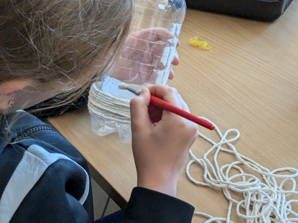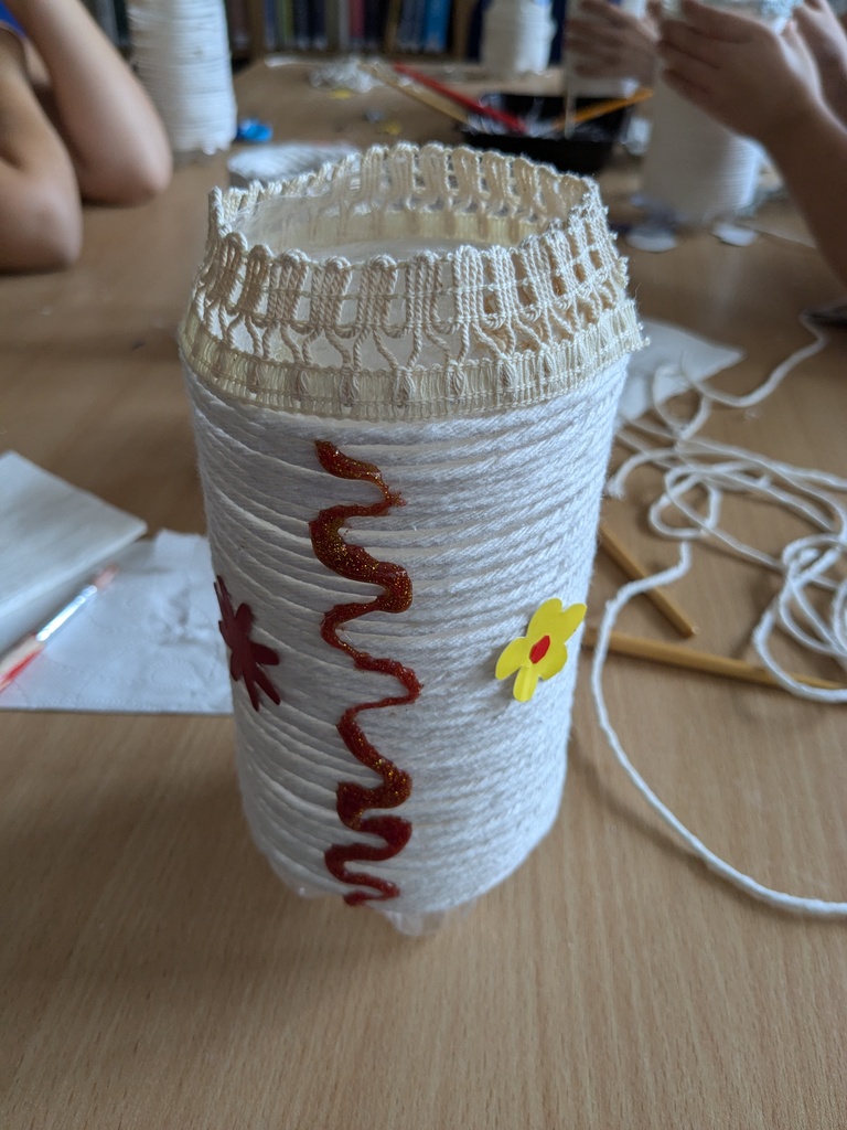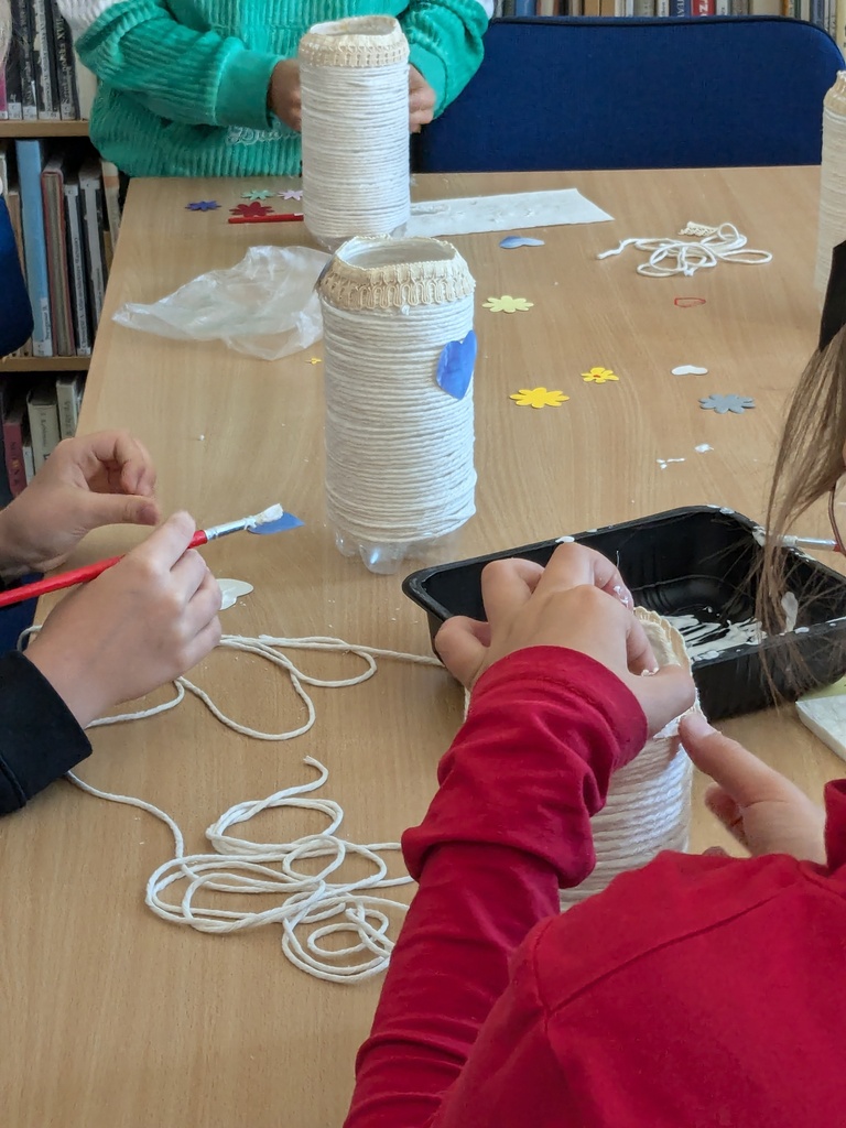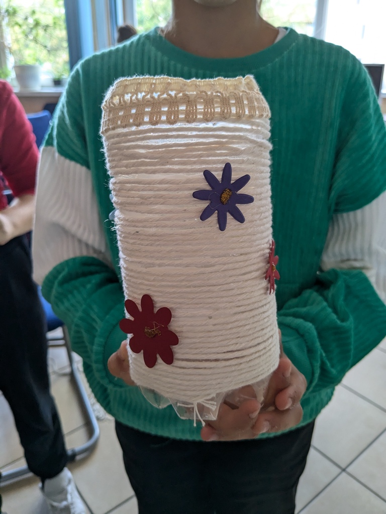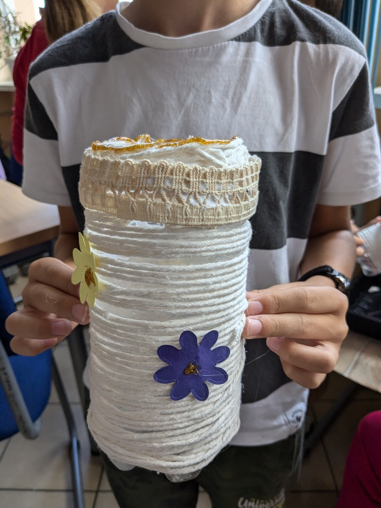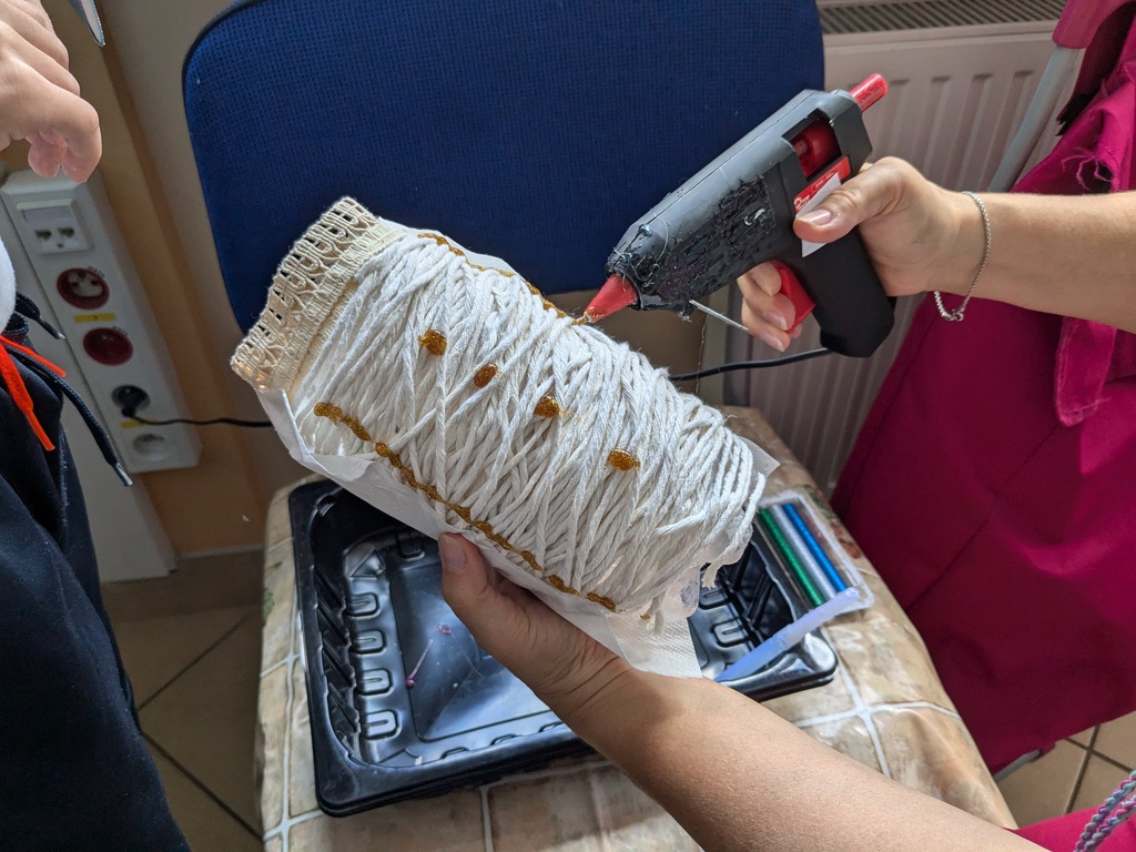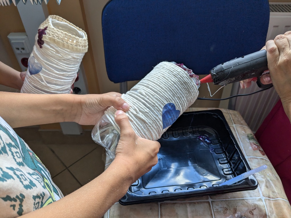 W części plastycznej uczestnicy przeszli do zaangażowania w plecenie… własnych rąk. Z plastikowych butelek i sznurka miały powstać recyklingowe doniczki, wazoniki lub osłonki na coś ważnego. Oplatanie sznurkiem butelek okazało się równie trudne, co wymyślanie kompozycji słów, ale sprawiło dużo frajdy. I co ważne, wszyscy pracę wykonywali w skupieniu i bardzo starannie. Nawet pani, która była z grupą jako opiekunka, dała się wciągnąć w zabawę i stworzyła swoją osłonkę. Być może zasadzi w niej wrzos lub pomidorka na wiosnę 🙂