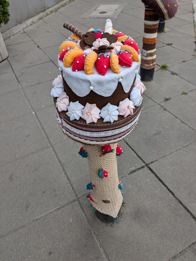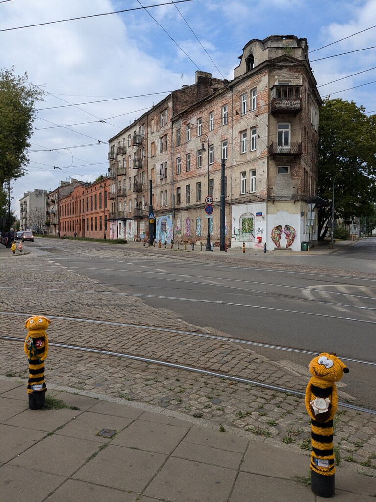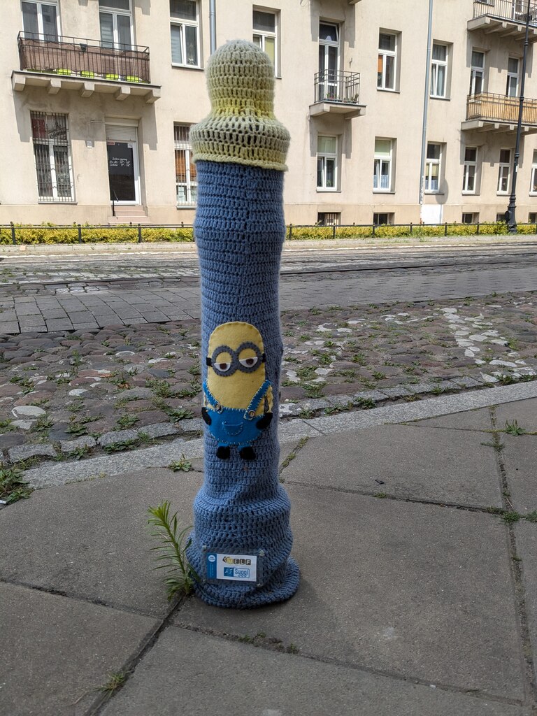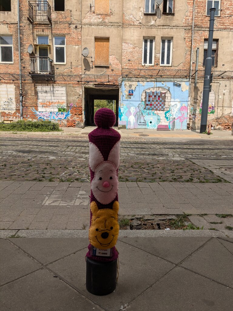 Odwiedziliśmy również działającą na Targówku Fabrycznym Wypożyczalnię nr 49 przy ul. Księcia Ziemowita 16. Zanim tam doszliśmy, podziwialiśmy nie tylko ślady przeszłości, lecz również… współczesne ozdoby ulicy Kawęczyńskiej – wyszydełkowane ubranka dla słupków.