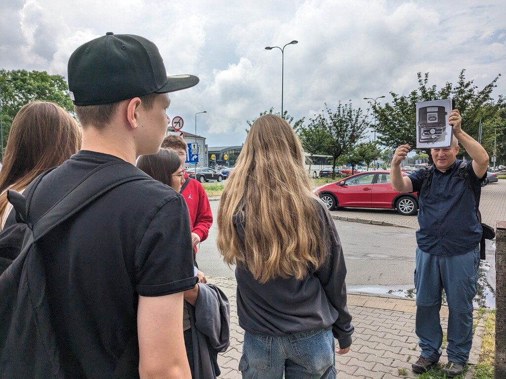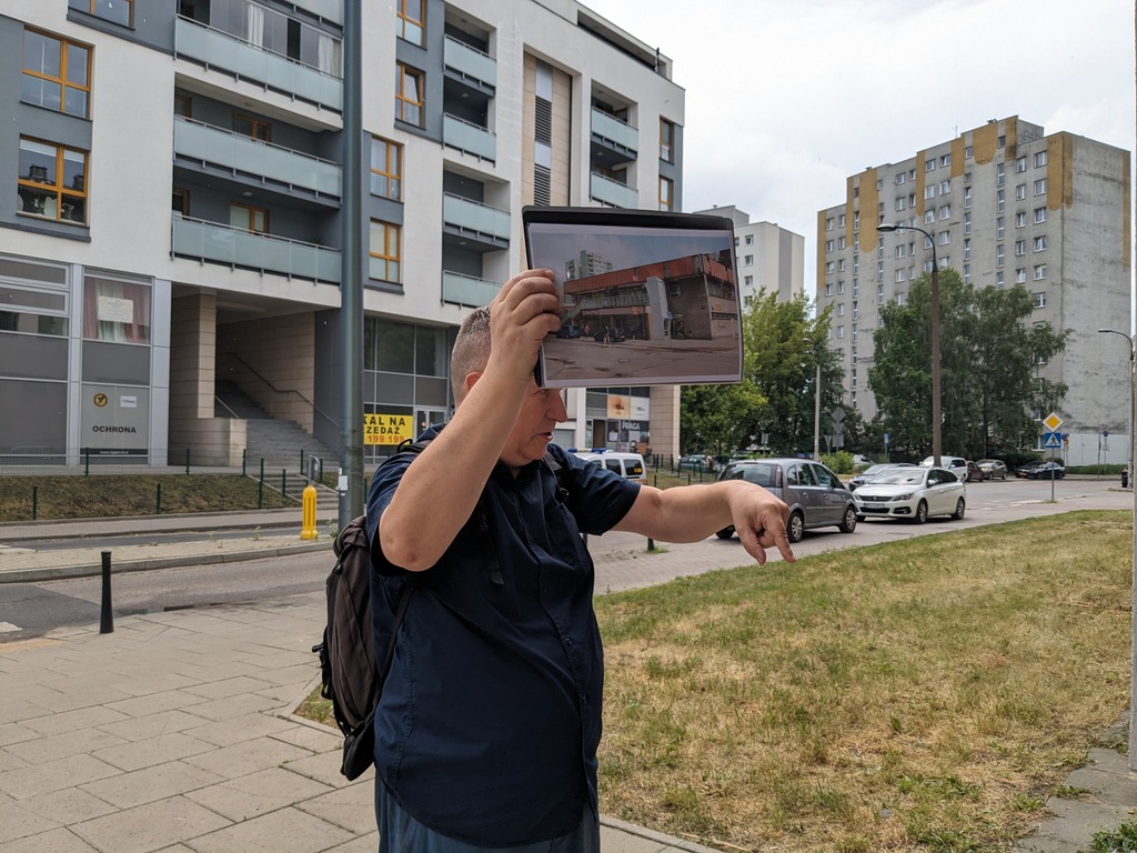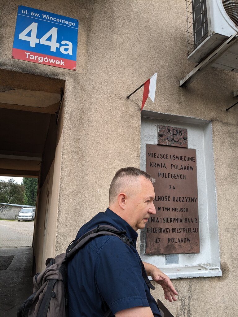Poznaliśmy lokalizację hali dawnej Huty Szkła Targówek, która dziś jest częścią budynku popularnej sieci dyskontów. W hucie przed wojną produkowano eksperymentalne szklane granaty. Potem spacerowaliśmy po ulicach zabudowanych nowoczesnymi blokami, by trafić na uliczkę, na której zachowała się oryginalna zabudowa z lat 30. XX w. Przed deszczem schowaliśmy się w budynku, gdzie znajdowała się kiedyś centrala telefoniczna i gdzie po wojnie odnaleziono ukryty przez powstańców warszawskich skład broni.