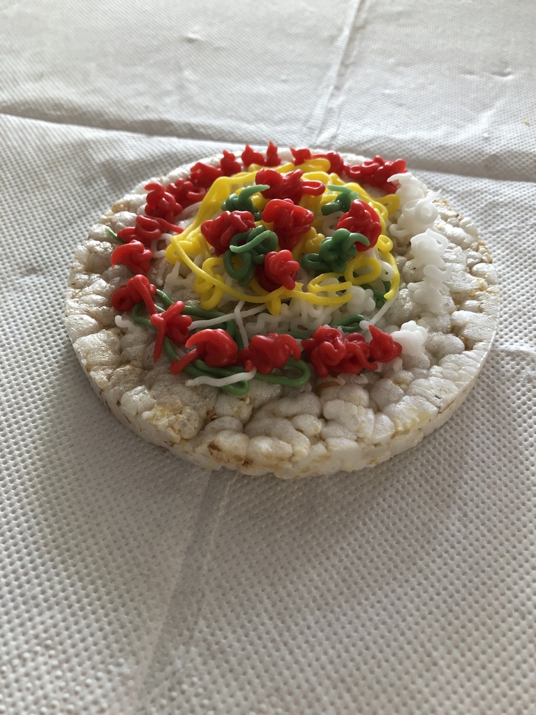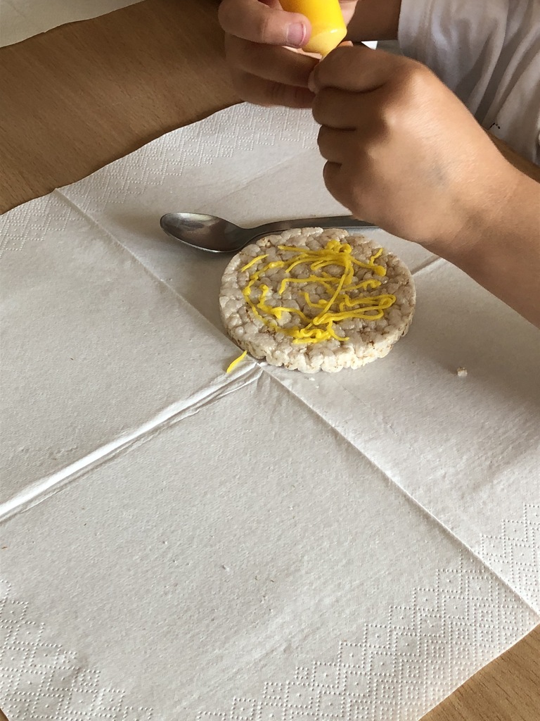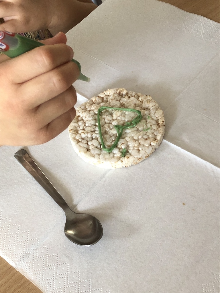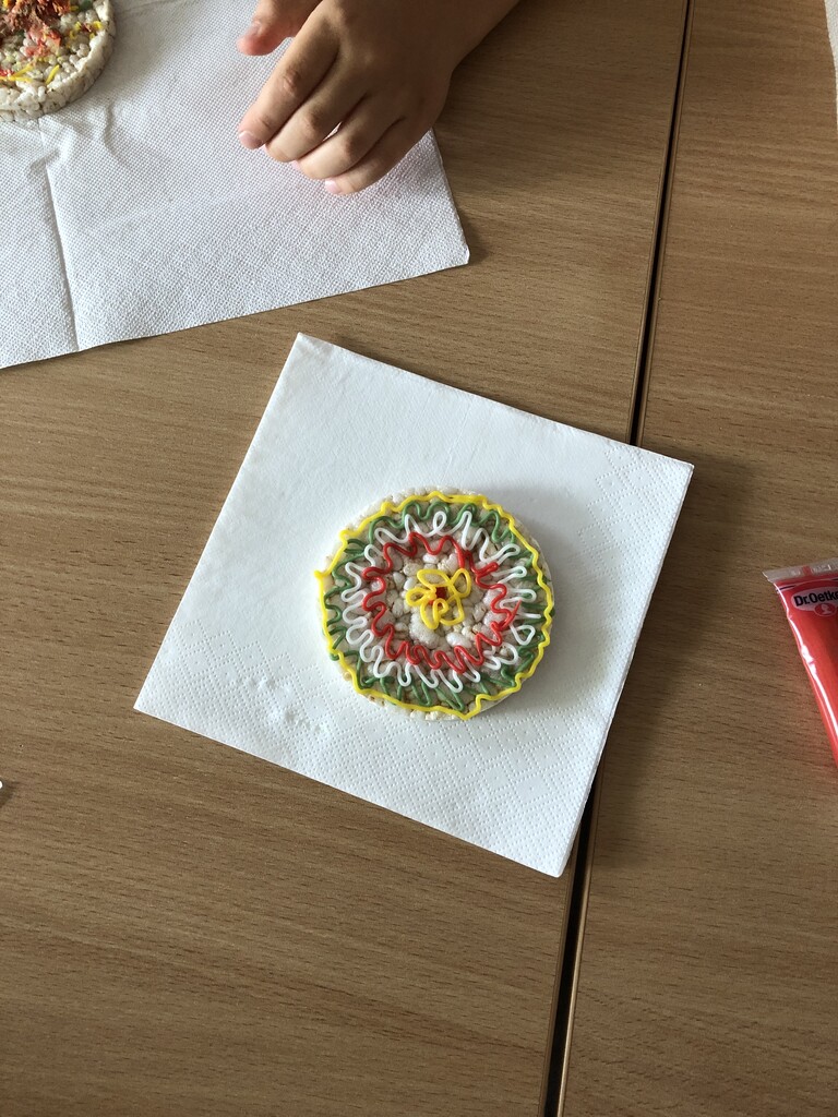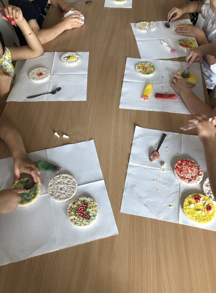 W trakcie plastycznej części warsztatów dzieci zdobiły położone na papierowych serwetkach wafelki ryżowe (zamiast ciastek, by było zdrowo) lukrem (by jednak było słodko i kolorowo). Zabawa z pisakami buła morowa! Przedszkolaki współpracowały w kwestii wymieniania się kolorami pisaków. Jednak na koniec doszły do wniosku, że przygotowywanie pięknych rzeczy jest też męczące – bolały je spracowane od wyciskania lukru z tubek dłonie. Wniosek końcowy: mamę też pewnie bolą ręce, więc trzeba będzie jej pomagać, jak również pomasować ręce po tym, gdy przygotuje pyszne jedzenie.