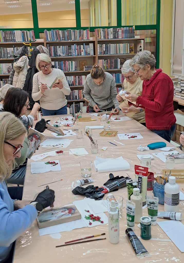 Kolejne warsztaty rękodzieła w ramach projektu „Oswajamy starość i samotność” zgromadziły uczestników 21 listopada 2024 r. w Wypożyczalni dla Dorosłych i Młodzieży nr 72 (ul. Suwalska 11). Połączone siły dwóch placówek (Wypożyczalni nr 2 i Wypożyczalni nr 72) wspierały działania instruktora z firmy BellPastel, która zaprojektowała wyjątkowo efektowny wizerunek anioła i czuwała nad jego wykonaniem. Efekty możemy podziwiać na zdjęciach.