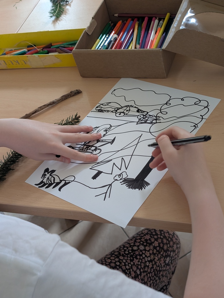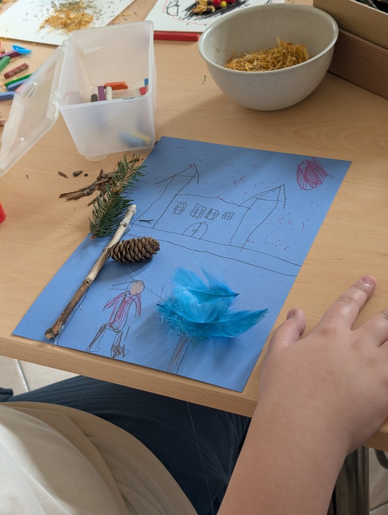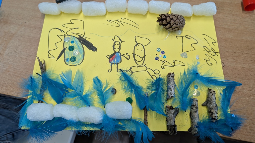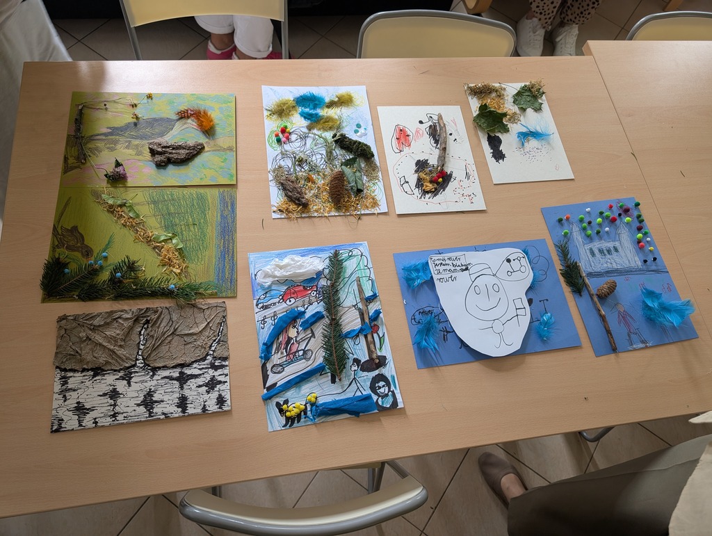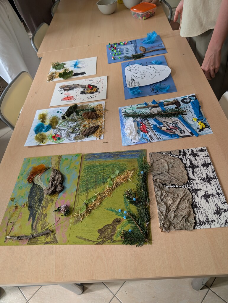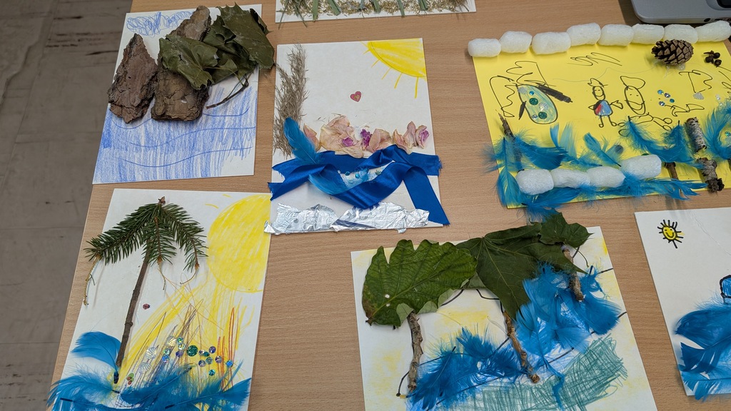 Dzieci tworzyły niezwykłe obrazy, wykorzystując nie tylko kredki, ale też całą gamę różnorodnych materiałów. Na pracach pojawiły się prawdziwe kawałki kory drzew, liście, miękkie pluszowe kulki, barwne piórka oraz inne „skarby” o przeróżnych fakturach i kształtach.