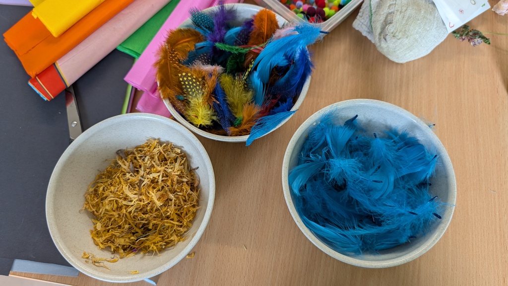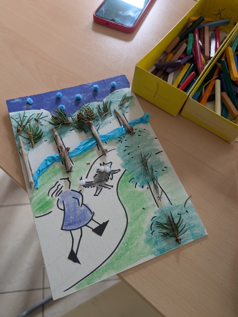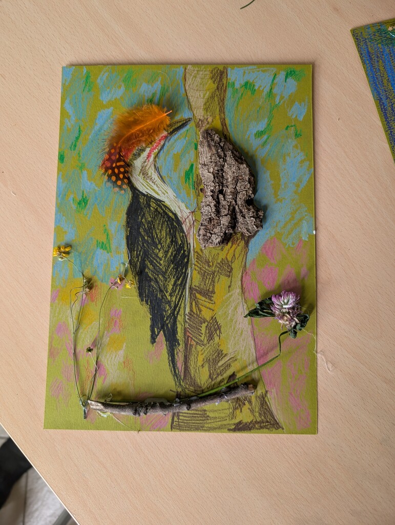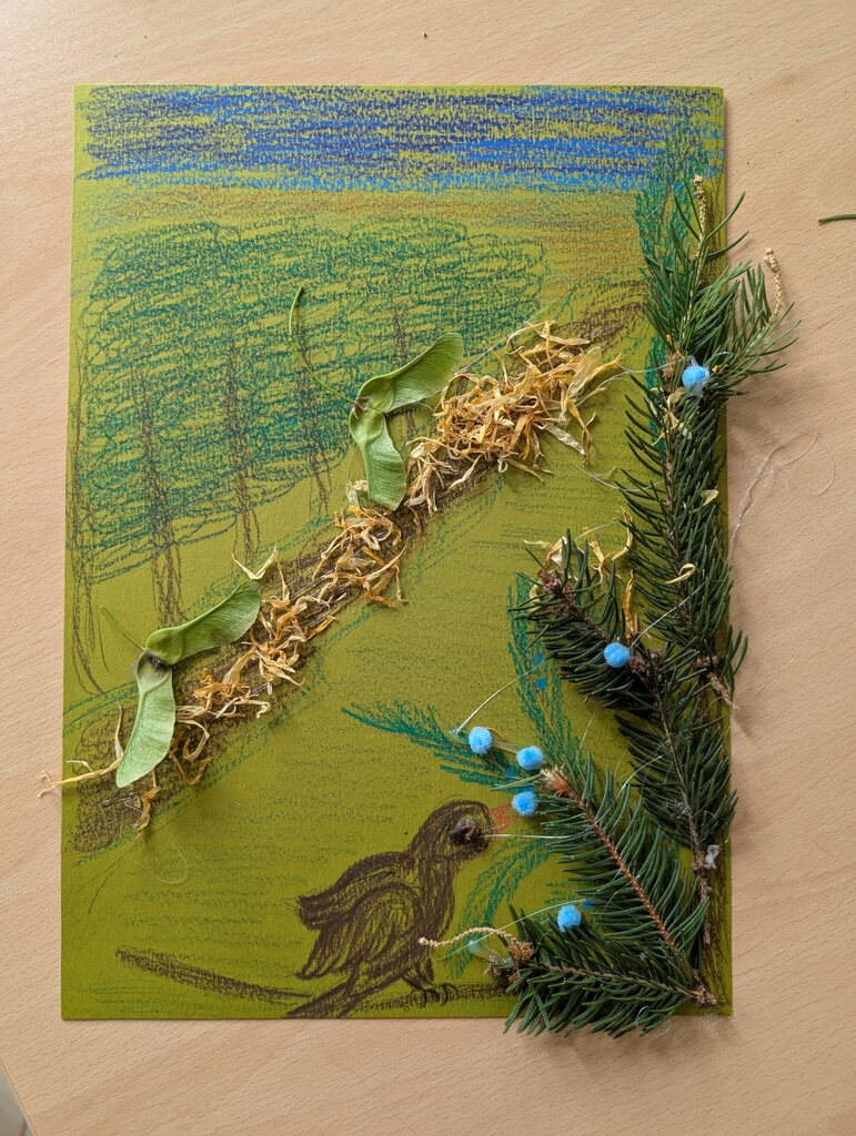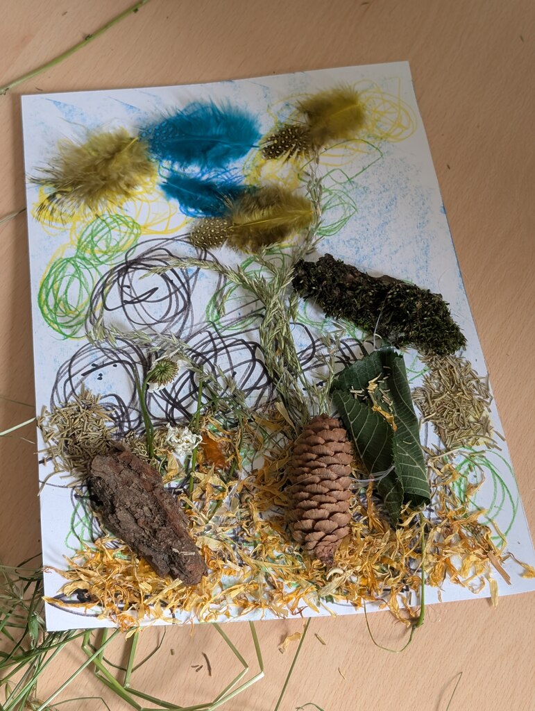 Dzieci tworzyły niezwykłe obrazy, wykorzystując nie tylko kredki, ale też całą gamę różnorodnych materiałów. Na pracach pojawiły się prawdziwe kawałki kory drzew, liście, miękkie pluszowe kulki, barwne piórka oraz inne „skarby” o przeróżnych fakturach i kształtach.
