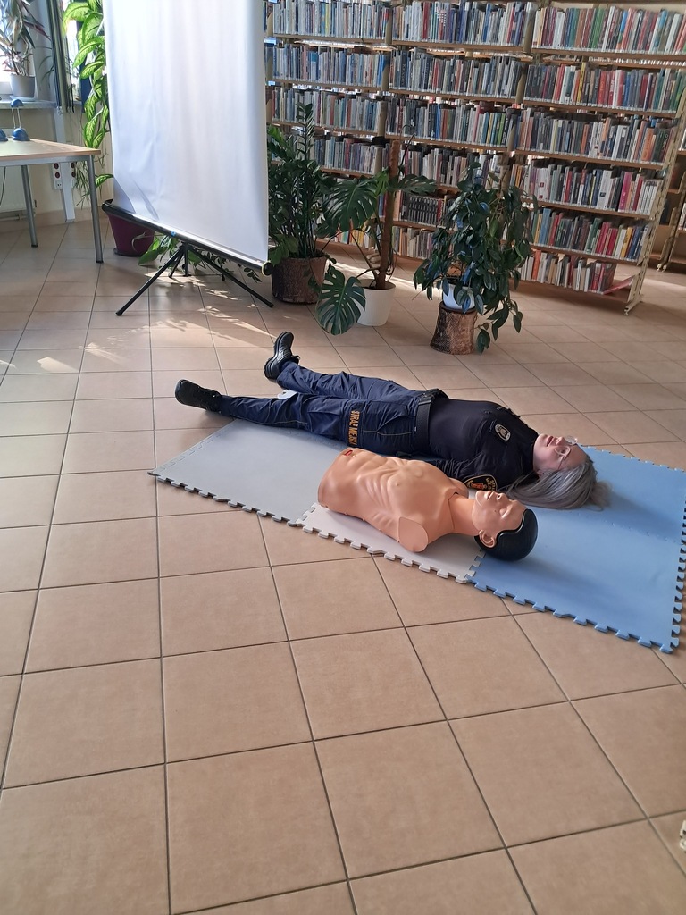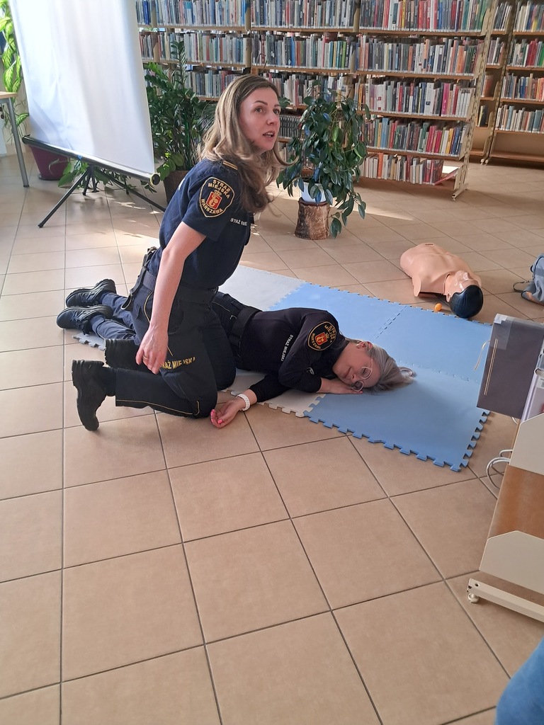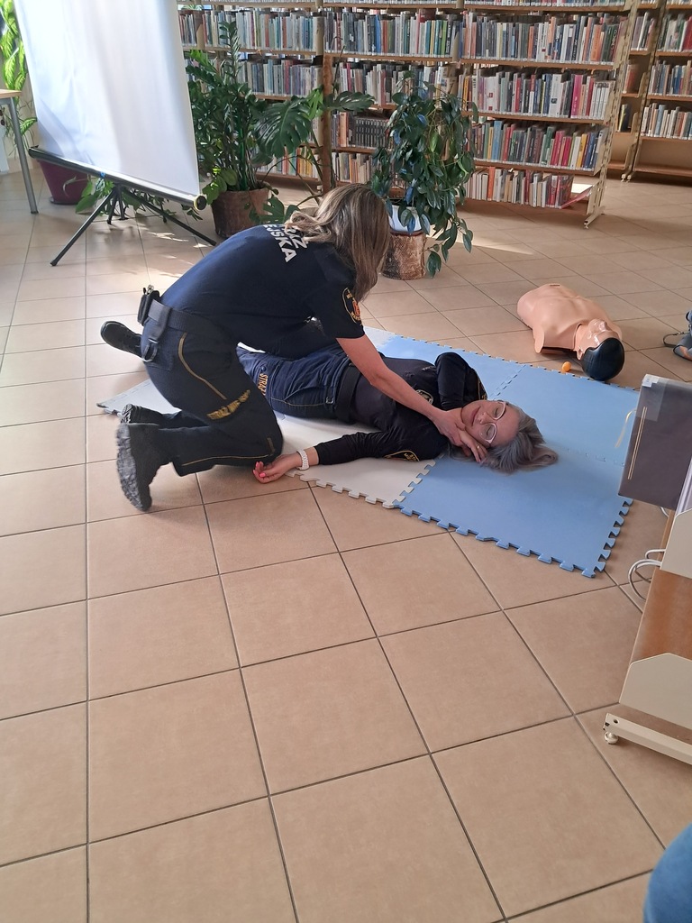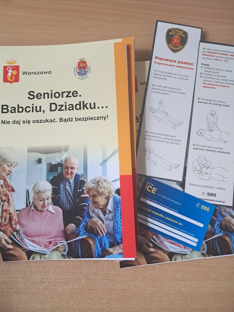 W drugiej części spotkania zostały omówione zasady udzielania pierwszej pomocy przedmedycznej, czyli jak należy się zachować i co zrobić, by pomóc osobie poszkodowanej. Funkcjonariusze opowiedzieli również o karcie ICE, której skrót oznacza „w nagłym wypadku”, a także o aplikacji „Bezpieczeństwo osobiste”. Karta ICE to plastik wielkości wizytówki. Znajduje się na niej imię i nazwisko właściciela oraz dane osobowe i numery telefonów do dwóch osób, które należy powiadomić w razie nagłego wypadku. Aplikacja „Bezpieczeństwo” zawiera takie dane jak grupa krwi, uczulenia, przyjmowane leki. Zarówno karta, jak i aplikacja mają zwiększyć bezpieczeństwo osób starszych w nagłych wypadkach.