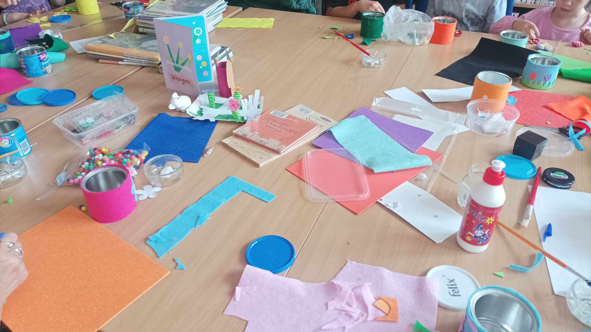 14.05.2024 w Bibliotece dla Dzieci i Młodzieży nr 53 świętowaliśmy Dzień Sąsiedzki. Na tę uroczystość zaprosiliśmy naszych małych i dużych czytelników. Było to spotkanie międzypokoleniowe. Wśród naszych gości były dzieci, ich rodzice, a także seniorzy. Wszyscy ochoczo przystąpili do wykonania ekologicznego pudełeczka na drobiazgi. W tym celu ozdabialiśmy metalową puszkę filcem, kwiatkami zrobionymi na szydełku (przygotowanymi wcześniej przez panią bibliotekarkę), diamencikami i cekinami.
