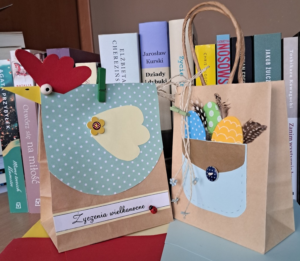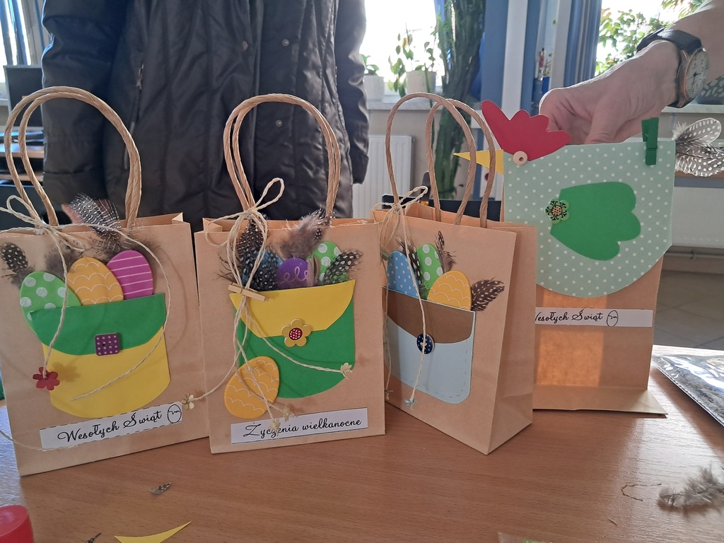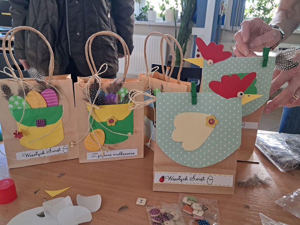 Głównym punktem programu było wykonanie papierowych torebek na drobne upominki. Seniorzy z entuzjazmem i precyzją angażowali się w twórcze działania, wykorzystując różnorodne materiały dekoracyjne, takie jak kolorowe papiery, sznurki i naklejki o tematyce wielkanocnej. Efektem ich pracy były piękne, własnoręcznie wykonane torebki, które z pewnością przyczynią się do sprawienia radości obdarowanym.
