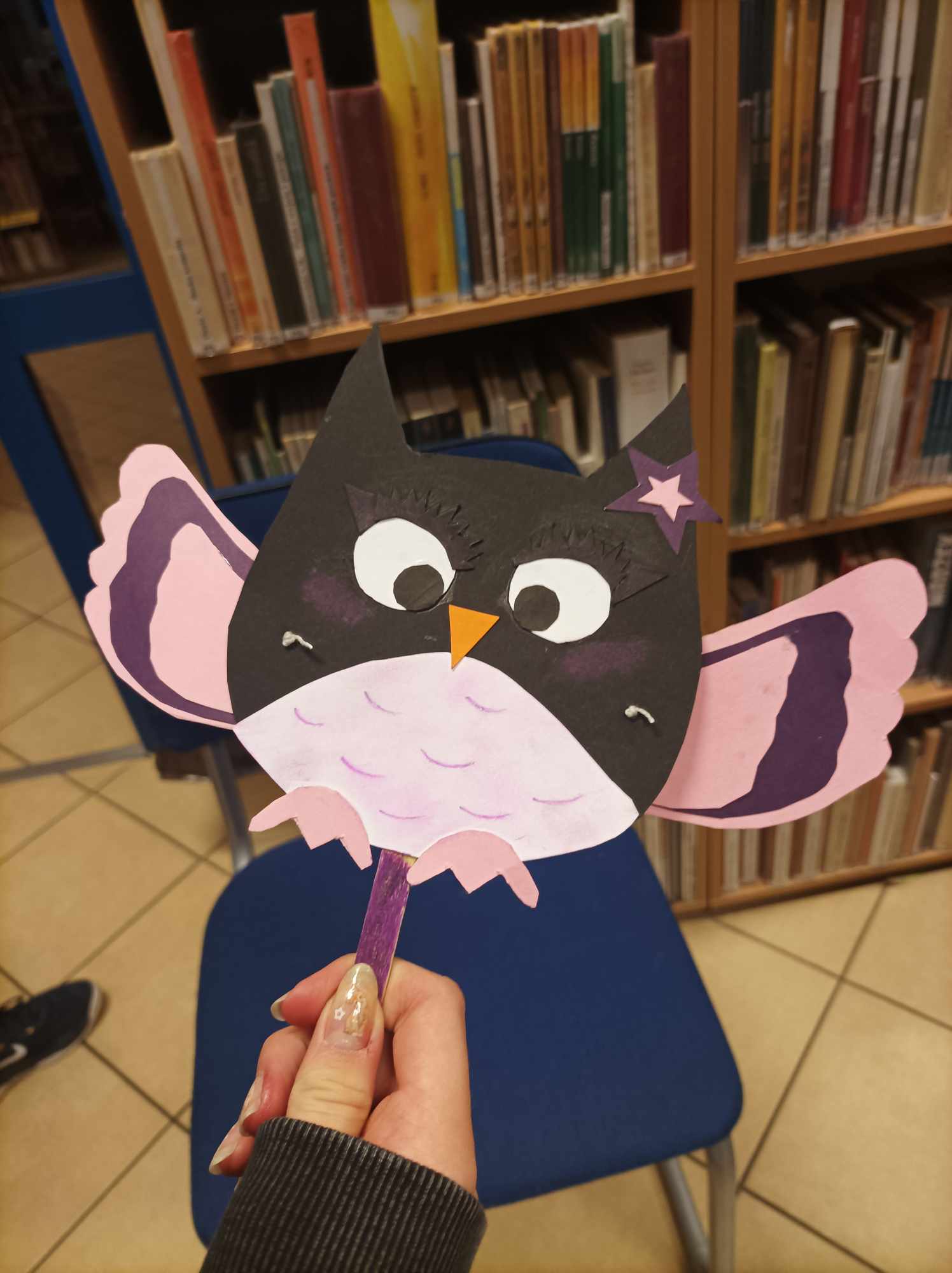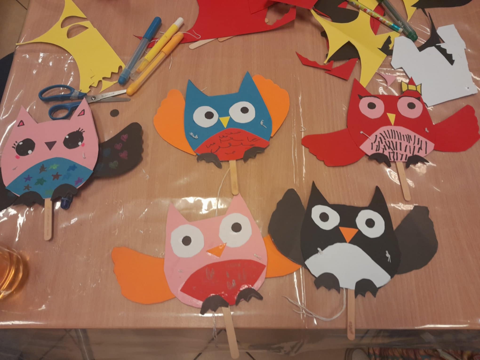 - kącik plastyczny „Fruwająca sowa” – dzieci wykonywały poruszające skrzydełkami wielobarwne sówki. Powstały piękne, kolorowe ptaki.