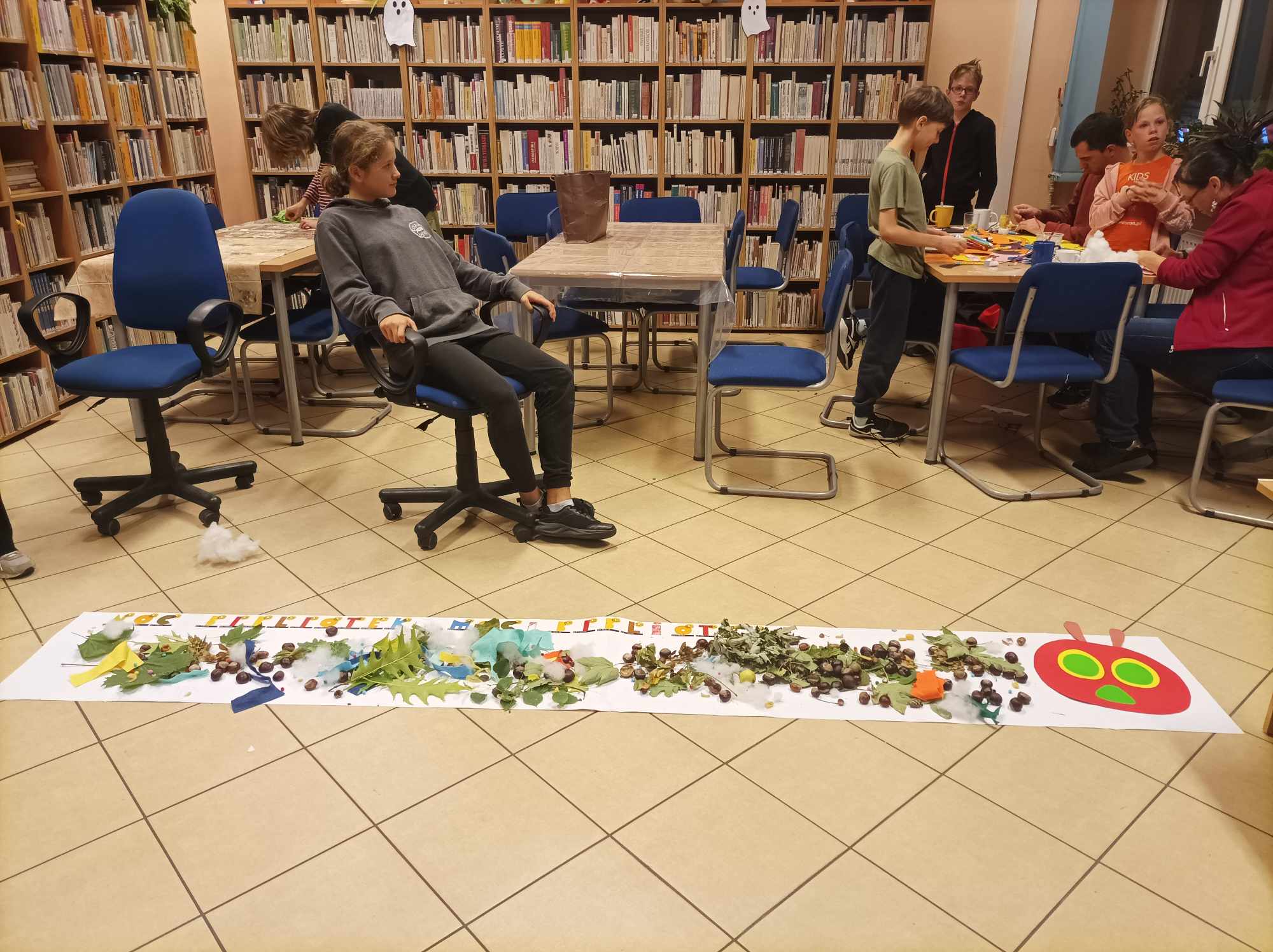 - warsztat sensoryczny „Gąsienica mocy”. W tej części wieczoru przeczytałyśmy dzieciom zabawną książkę interaktywną E. Carle pt. „Bardzo głodna gąsienica”, a następnie „nakarmiliśmy” naszą, wykonaną z papieru, biblioteczną gąsienicę „potrawami”: listkami, kasztanami, żołędziami, małymi gruszkami, mięciutkim filcem, puszystą watą, kolorowym makaronem.