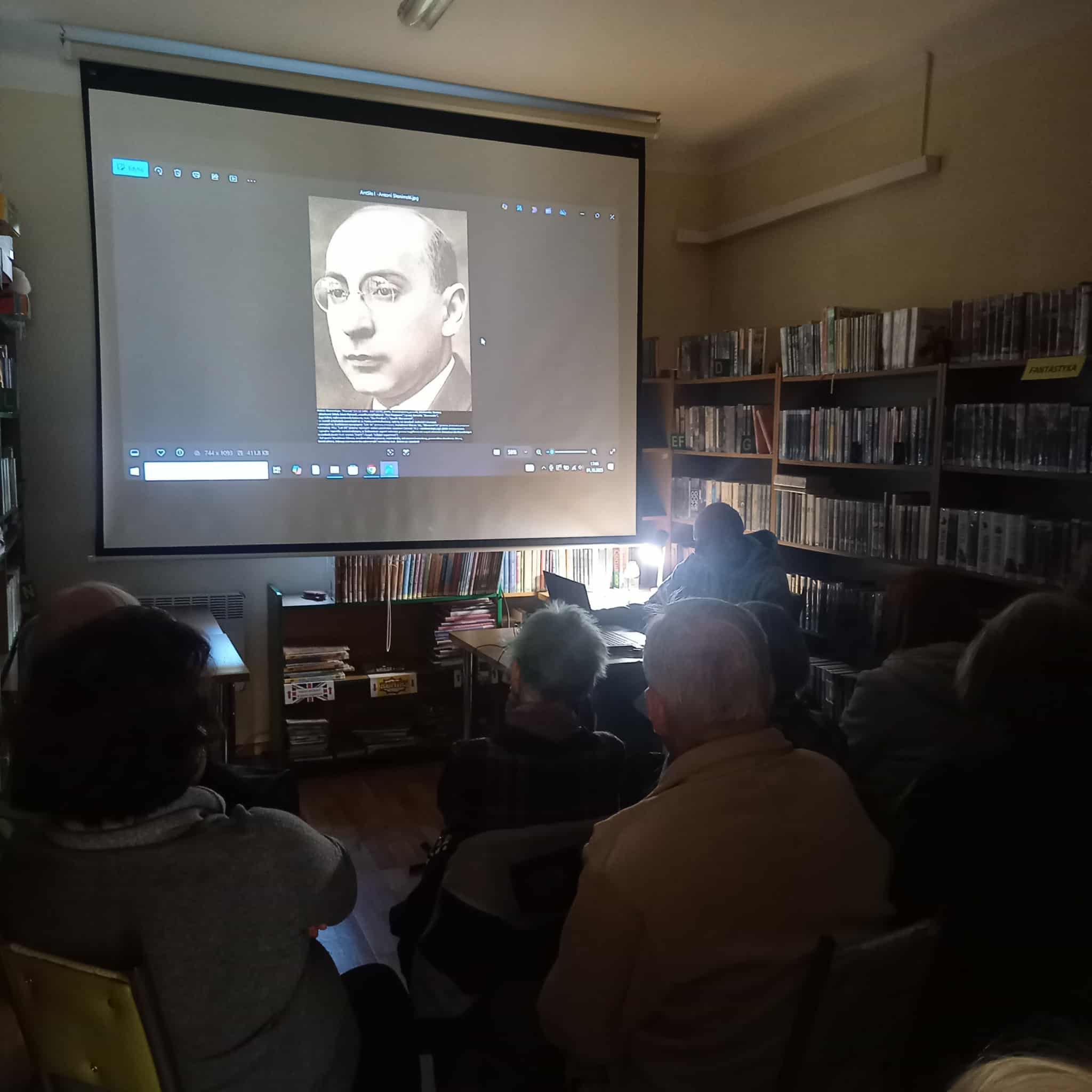 Wysłuchaliśmy wielu ciekawostek i anegdot o tym wybitnym poecie i felietoniście, członku słynnej grupy poetyckiej Skamander. Słuchaliśmy z zainteresowaniem o jego życiu i twórczości,; obejrzeliśmy też zdjęcia. Pan Hubert opierał swój wykład w większości na faktach opisanych w książce autorstwa Joanny Kuciel-Frydryszak „Słonimski. Heretyk na ambonie”, oczywiście dostępnej w naszych bibliotekach.
