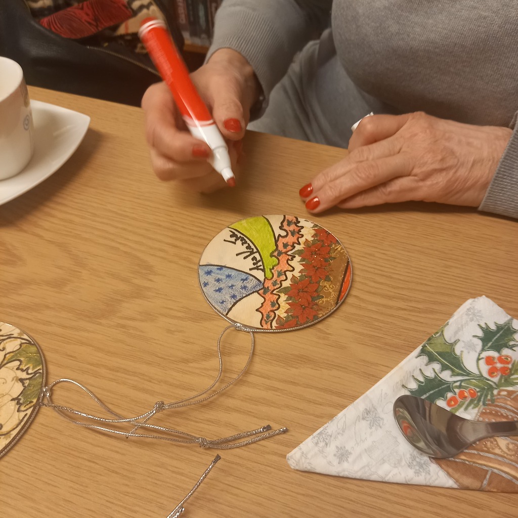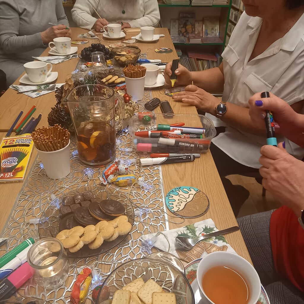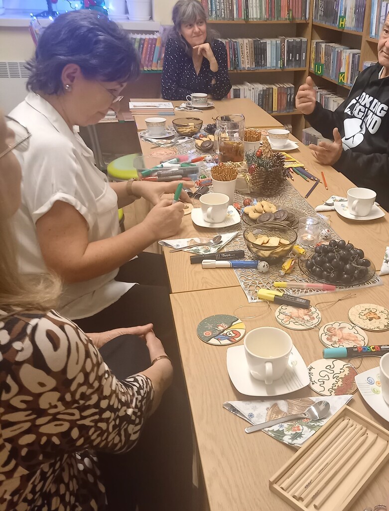 10 grudnia 2024 r. w Wypożyczalni nr 37 odbyło się kolejne spotkanie „Między regałami”. Tym razem naszym gościem specjalnym była Agnieszka Kazała – pisarka, ilustratorka. W świątecznym klimacie, przy blasku świec i ciepłej herbatce, rozmawialiśmy na różne tematy. Rozmowy dotyczyły zarówno książek – jak przystało na spotkanie w bibliotece – jak również uroków i problemów życia codziennego. Atrakcją, która oderwała nas od spraw przyziemnych, były przygotowane przez panią Agnieszkę drewniane bombki, które uczestnicy spotkania mieli za zadanie udekorować według własnej inwencji. Jak się okazało, kolorowanie jest doskonałym sposobem relaksacji i sprawdzenia własnej kreatywności.