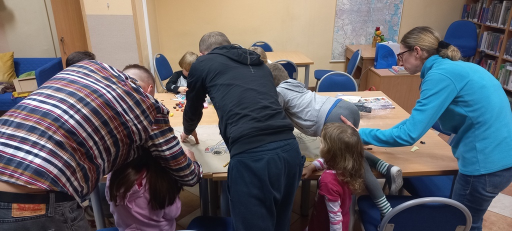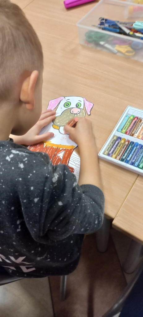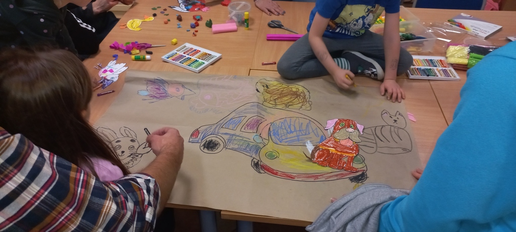 Gdy drzwiczki teatru zostały zamknięte, uczestnicy spotkania przystąpili do wykonania pracy plastycznej. Po wysłuchaniu przygód Walentynki i jej towarzyszy powstał wspólny plakat nawiązujący do tej historii.