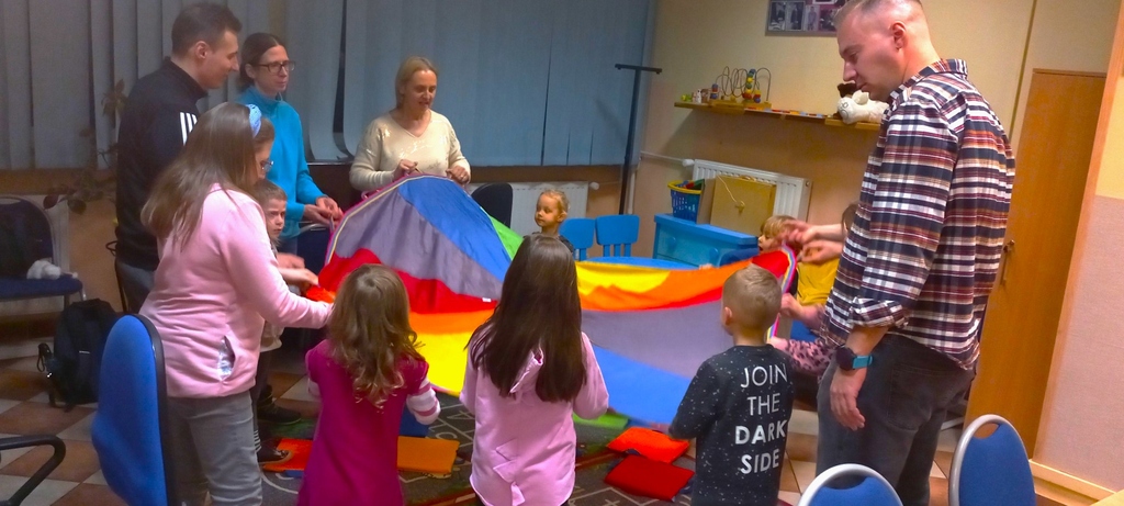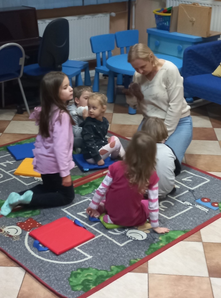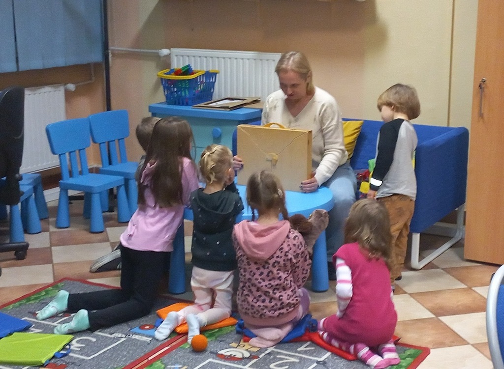 Na początku było trochę zabawy ruchowej z chustą animacyjną. Następnie Jadwiga zaprosiła dzieci w literacką podróż. Tym razem wybrane przez nas opowiadanie zostało przedstawione w formie teatrzyku Kamishibai. Na dzieci czekała mała, drewniana skrzyneczka, która po otwarciu stała się małą sceną. W środku niej czekała historia pt. „Rower Walentynki”. To urocze opowiadanie w formie wyliczanki zachęciło dzieci do wspólnego i głośnego czytania.