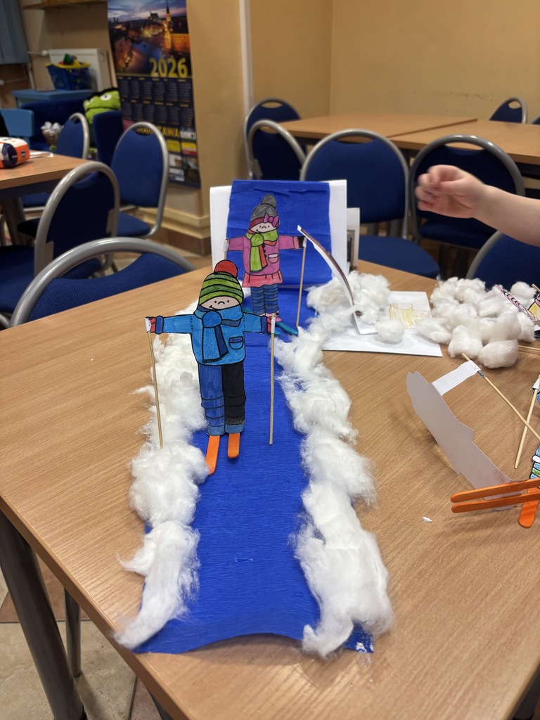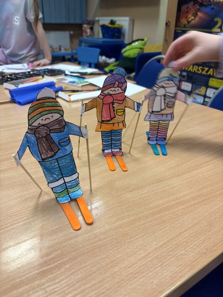 Nie zabrakło też ruchu i śmiechu! Wspólnie bawiliśmy się w zabawy z papierowymi kulkami, a na zakończenie dzieci wykonały kolorowe figurki narciarzy. Do zobaczenia w marcu!