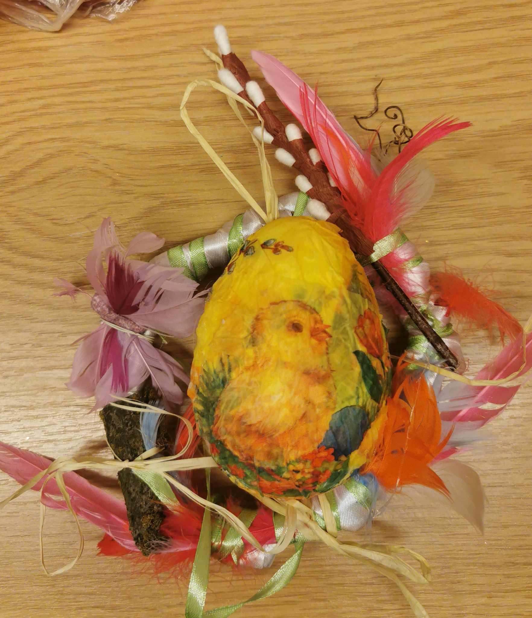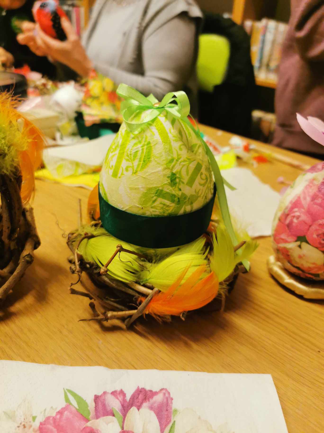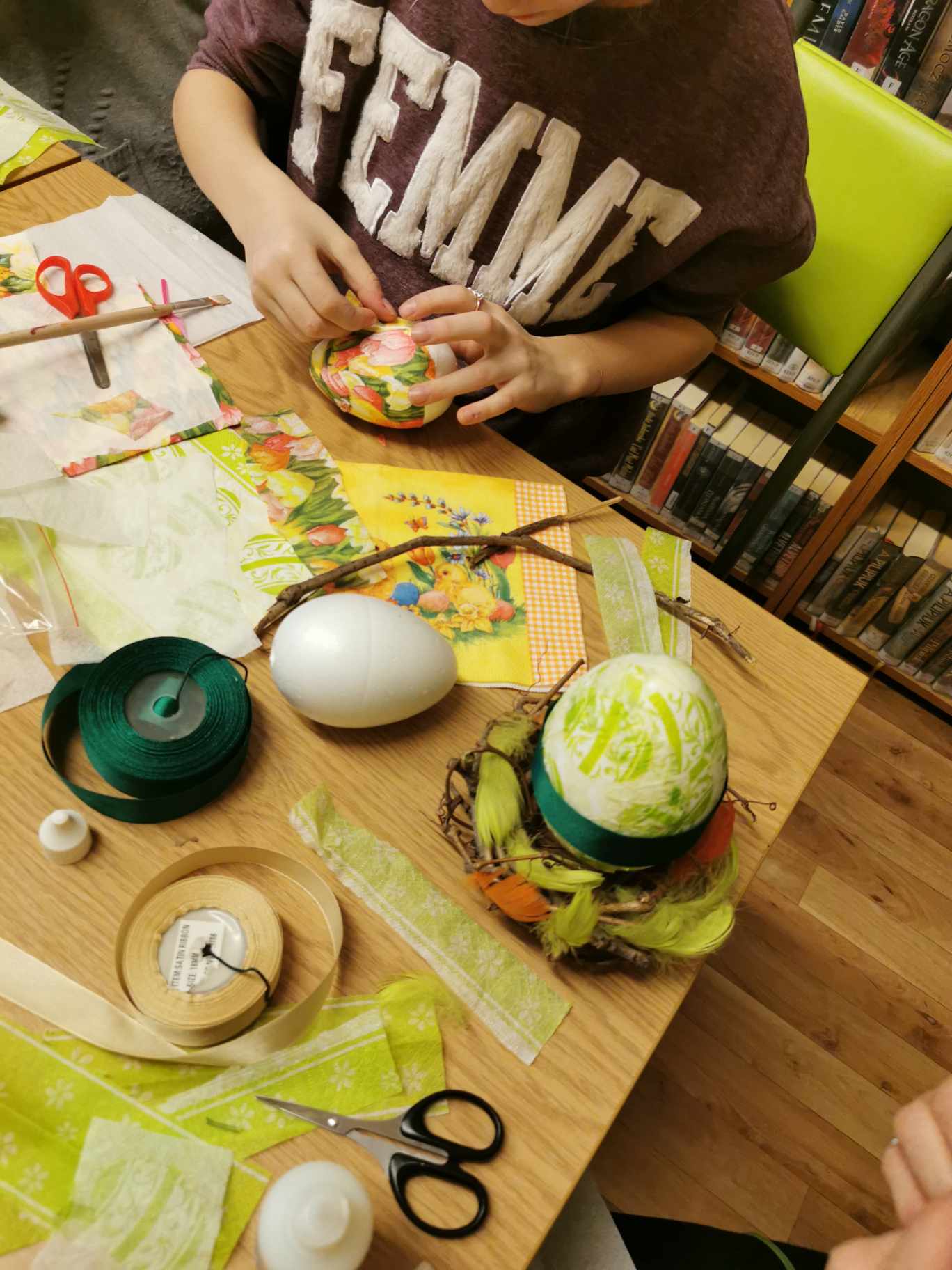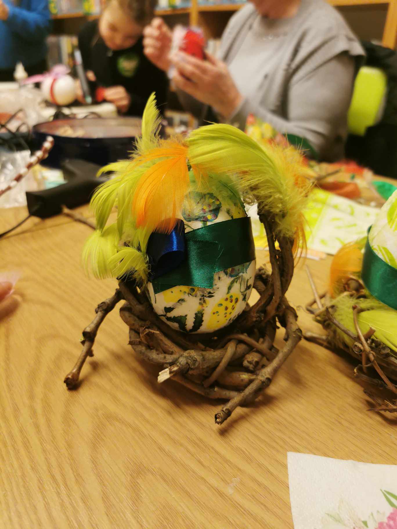 Styropianowe jajka, wstążeczki, piórka, gałązki i to, co wpadło w ręce, wykorzystali uczestnicy warsztatów w Wypożyczalni dla Dorosłych i Młodzieży nr 37. Dodatek kleju, no i oczywiście fantazji sprawiły, że powstały piękne dekoracje wielkanocne. Jak zawsze osoby, które brały udział w zajęciach, poznały nowe sposoby tworzenia takich ozdób.