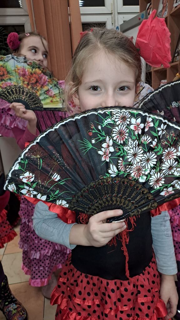 A jak jest gorąca Hiszpania, muszą być także tańce. I były! W cudownych strojach z Hiszpanii. Wszyscy młodzi uczestnicy zajęć zostali zaopatrzeni w suknie w przypadku dziewczynek i kapelusze dla chłopców. Małe kobietki otrzymały także kwiaty we włosy, wachlarze oraz kastaniety. I zaczęło się paso doble, a potem oczywiście flamenco – i to wszystko przy prawdziwej hiszpańskiej muzyce.