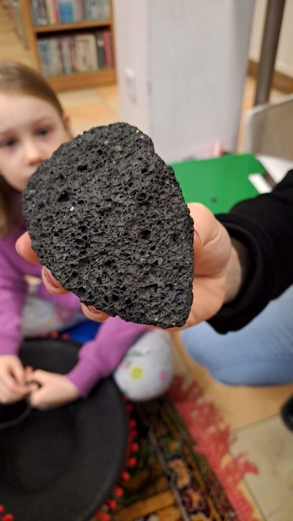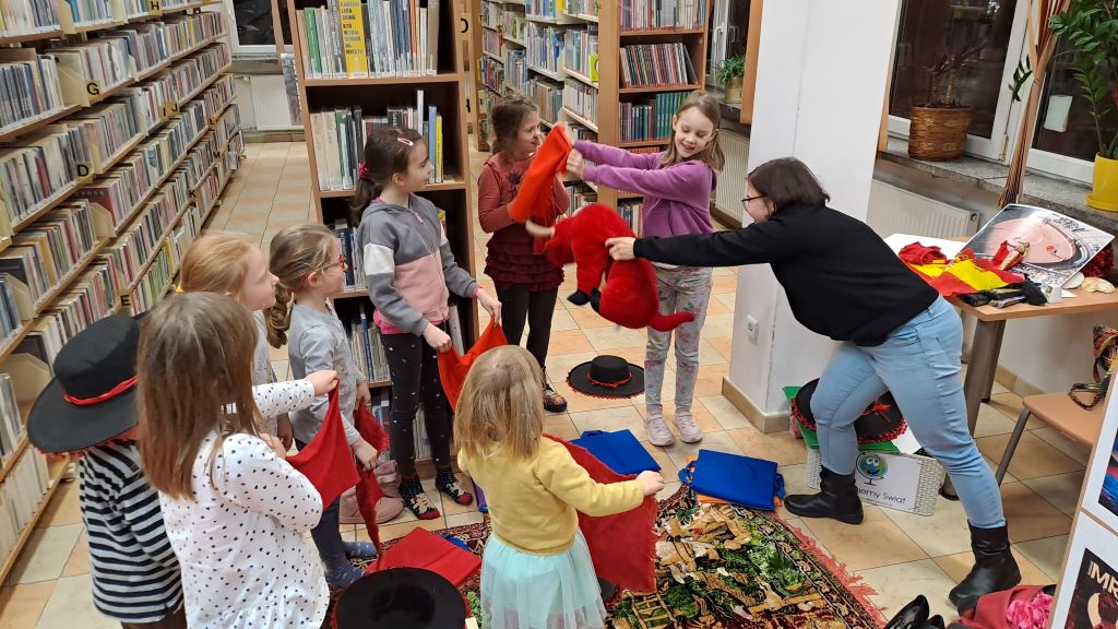 Aby ułatwić to dzieciom, na podłodze rozłożony został hiszpański dywan. Gdy już wszyscy usiedli, nastąpiło powitanie – oczywiście w języku hiszpańskim. Potem każde z dzieci otrzymało hiszpański kapelusz, za który musiało podziękować także po hiszpańsku. Oprócz kilku słów w tym języku dzieci dowiedziały się ciekawych faktów na temat sjesty, mogły dotknąć piasku z lawy, kamienia wulkanicznego a także porozmawiać na temat dań, które jadają Hiszpanie czy też poznać najsłynniejsze budowle, które można w tym kraju zobaczyć. Obejrzały także książeczkę pielgrzyma, z którą pani podróżniczka wędrowała szlakiem św. Jakuba. Dzieci mogły także naśladować torreadorów. Pomógł im w tym byczek Fernando, który przyjechał specjalnie na spotkanie z dziećmi. Dowiedzieliśmy się też, do czego służą Hiszpanom pomidory – i niekoniecznie jest to jedzenie – oraz poznaliśmy wiele, wiele innych ciekawostek.