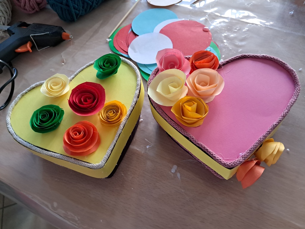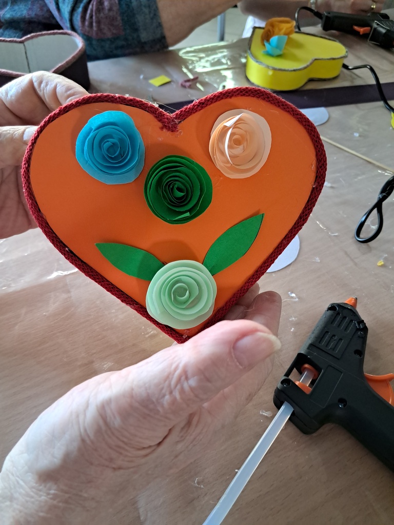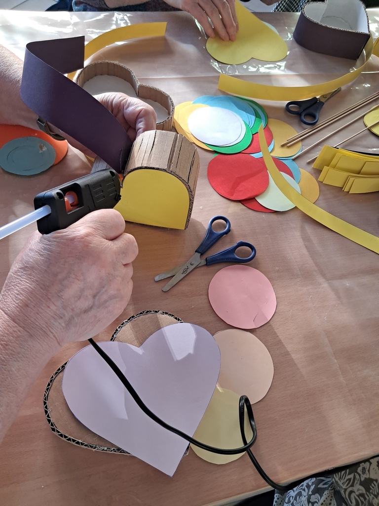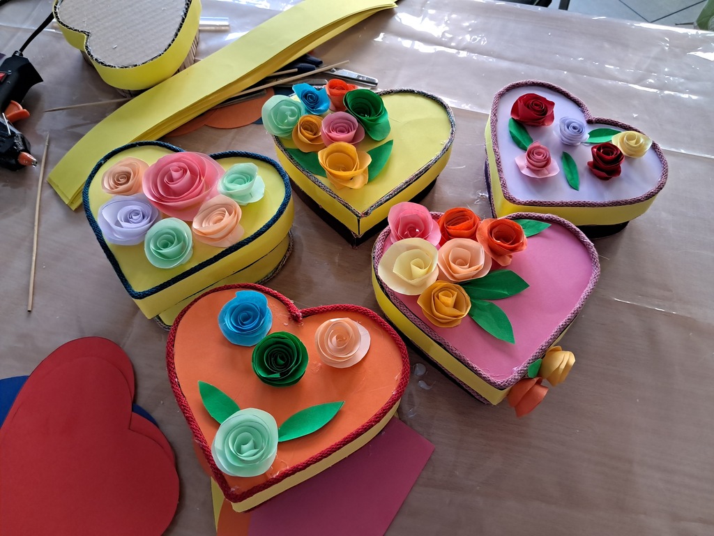 Podczas warsztatów uczestnicy wykonali ozdobne pudełka w kształcie serca, które zostały udekorowane ręcznie robionymi papierowymi kwiatami. Proces tworzenia nie tylko rozbudził wyobraźnię i kreatywność, ale także sprzyjał integracji międzypokoleniowej – młodsi i starsi uczestnicy wymieniali się doświadczeniami, inspirując się nawzajem.