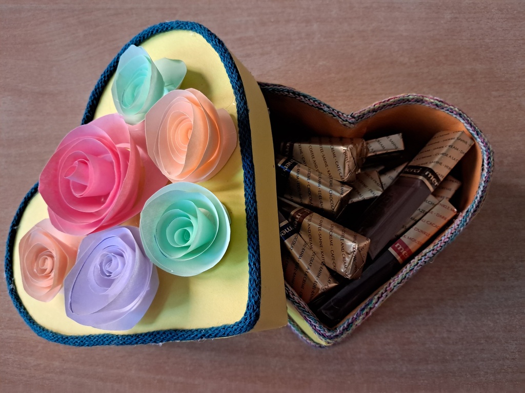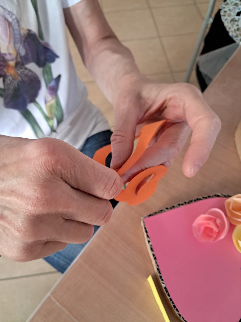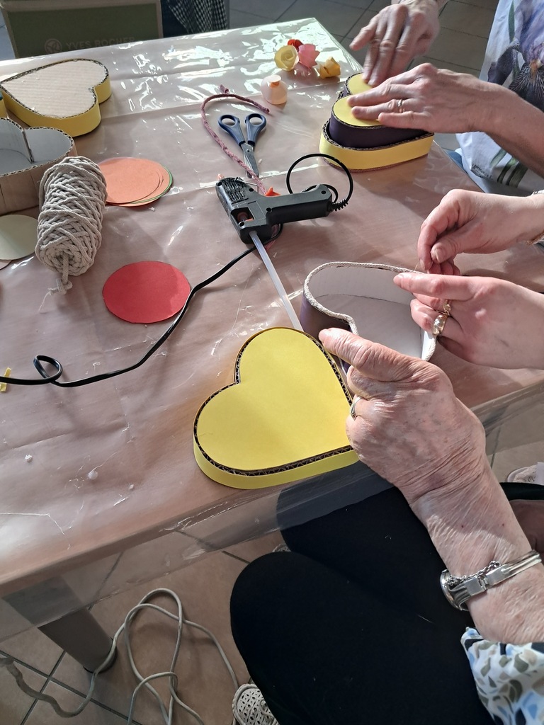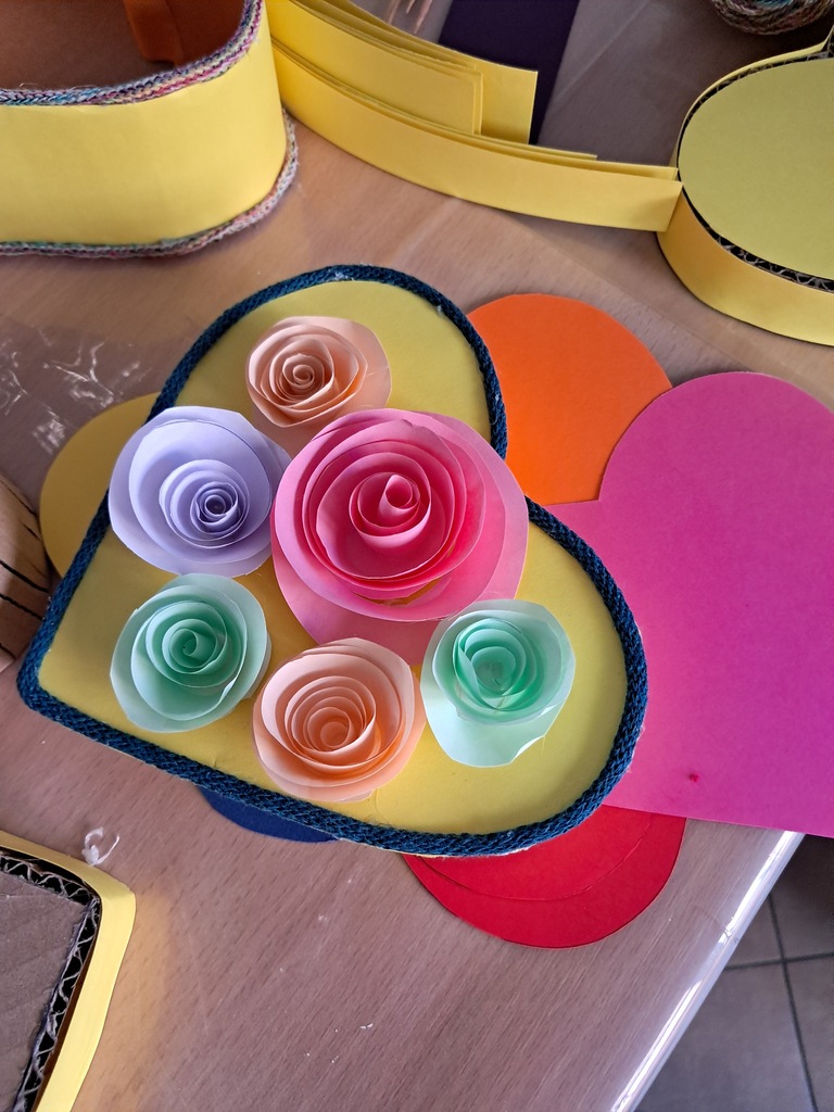 Podczas warsztatów uczestnicy wykonali ozdobne pudełka w kształcie serca, które zostały udekorowane ręcznie robionymi papierowymi kwiatami. Proces tworzenia nie tylko rozbudził wyobraźnię i kreatywność, ale także sprzyjał integracji międzypokoleniowej – młodsi i starsi uczestnicy wymieniali się doświadczeniami, inspirując się nawzajem.