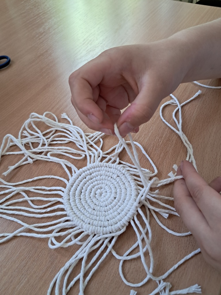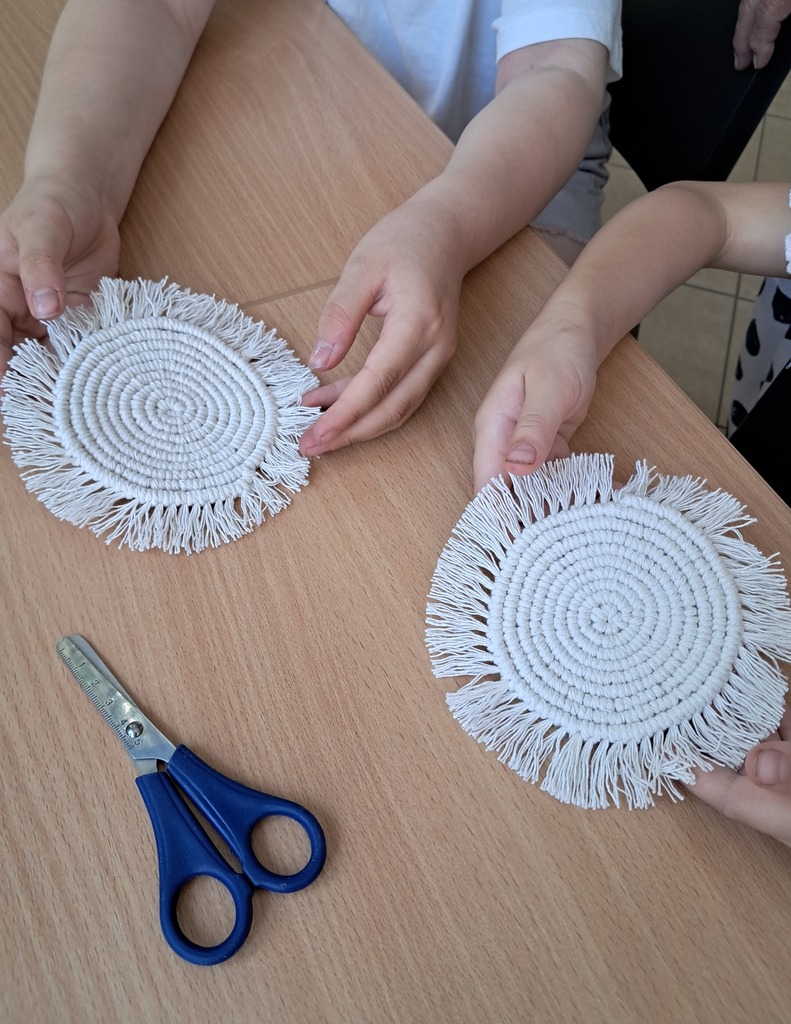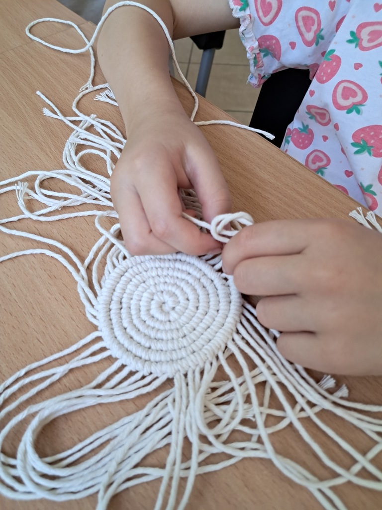 Uczestnicy spotkania poznali tajniki tworzenia makramy. Pod czujnym okiem prowadzących dzieci samodzielnie wykonały makramowe podkładki pod kubek, ucząc się wiązania supłów i dobierania dodatkowego sznurka. Efekty ich pracy były nie tylko praktyczne, ale również zachwycały estetyką i starannością wykonania.