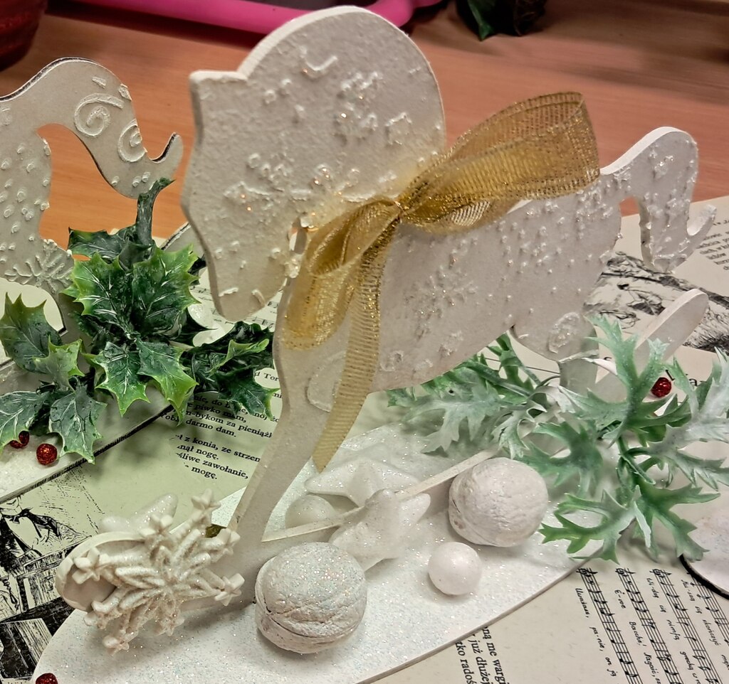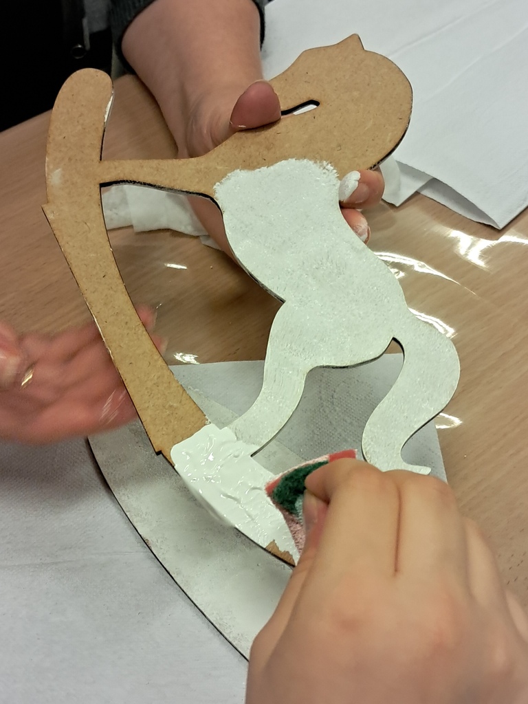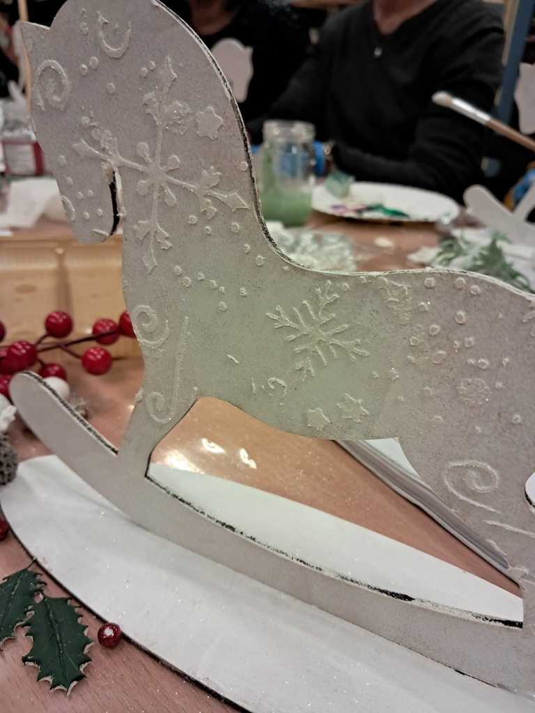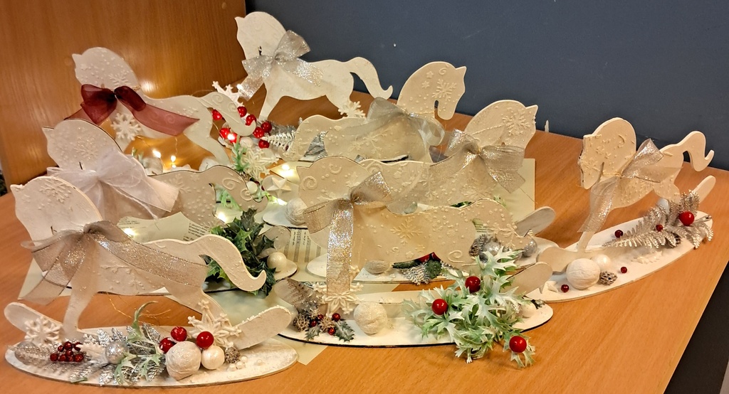 Święta zbliżają się już wielkimi krokami, więc czas pomyśleć o świątecznym wystroju mieszkania. Dekoracja domu na święta to przecież nie tylko choinka. Podczas warsztatów, które odbyły się 10 grudnia w Wypożyczalni nr 2, uczestnicy wykonali świątecznego konika na biegunach techniką mix media. Najpierw konik został pomalowany farbą akrylową, a następnie ozdobiony odlewami z masy lekkiej oraz pastą strukturalną. Całość dopełniliśmy świątecznymi dodatkami. Wyszło pięknie!