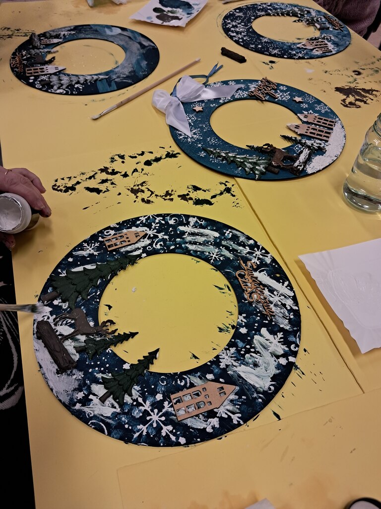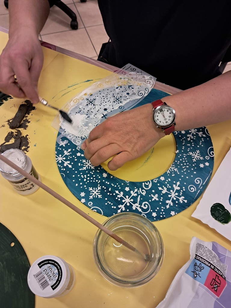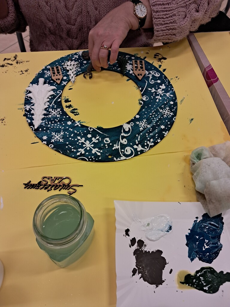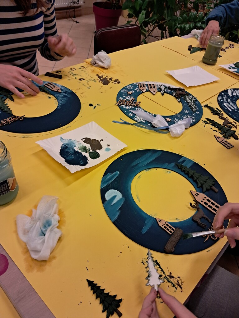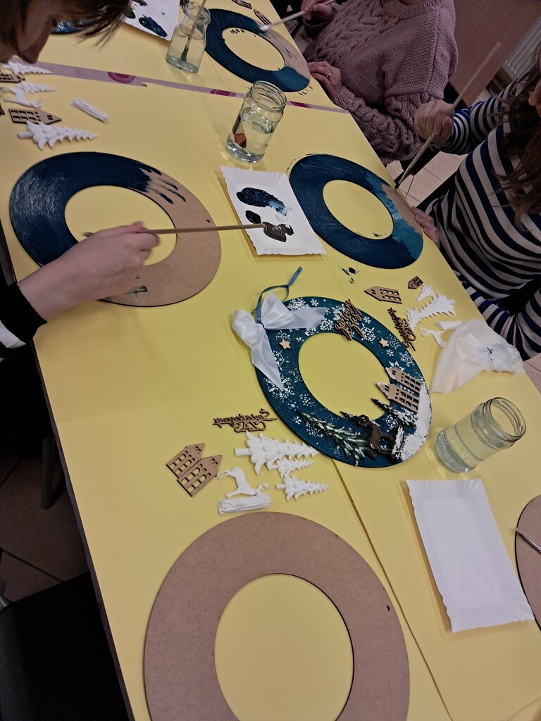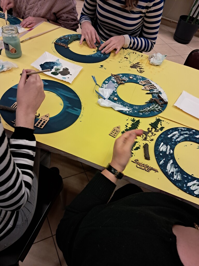 14 grudnia 2023 r. w Wypożyczalni nr 2 odbyły się warsztaty tworzenia wianka bożonarodzeniowego. Podczas zajęć uczestnicy wykonali wianek techniką mix media (technika łączenia różnorodnych materiałów). Bazą wianka była płyta HDF (drewnopodobna) o średnicy 30 cm, która została pomalowana farbą akrylową, a następnie ozdobiona odlewami z masy lekkiej oraz pastą strukturalną. Udało nam się stworzyć wspaniałą ozdobę, która będzie cieszyć oko w tym świątecznym czasie.