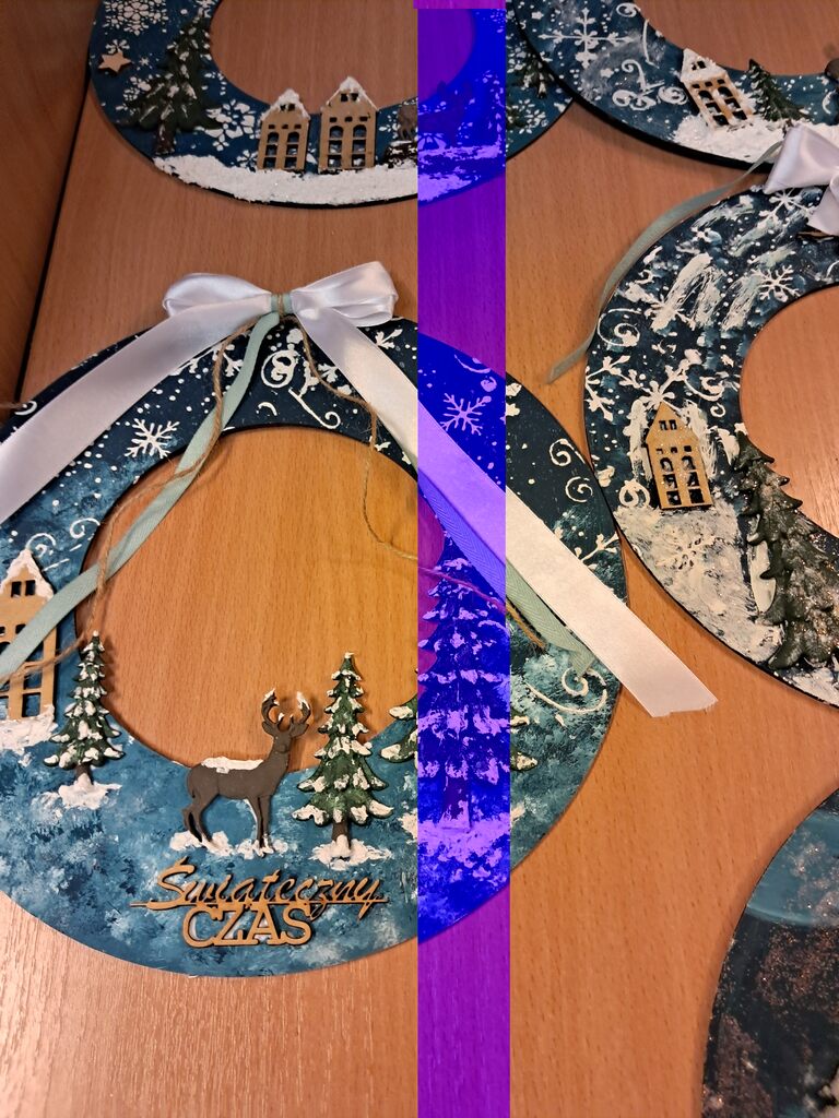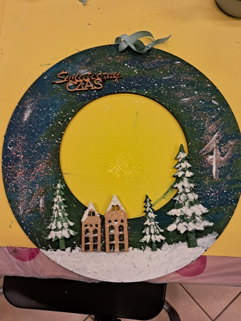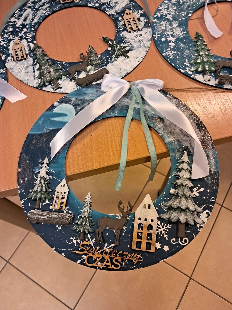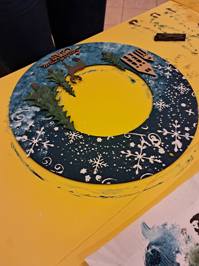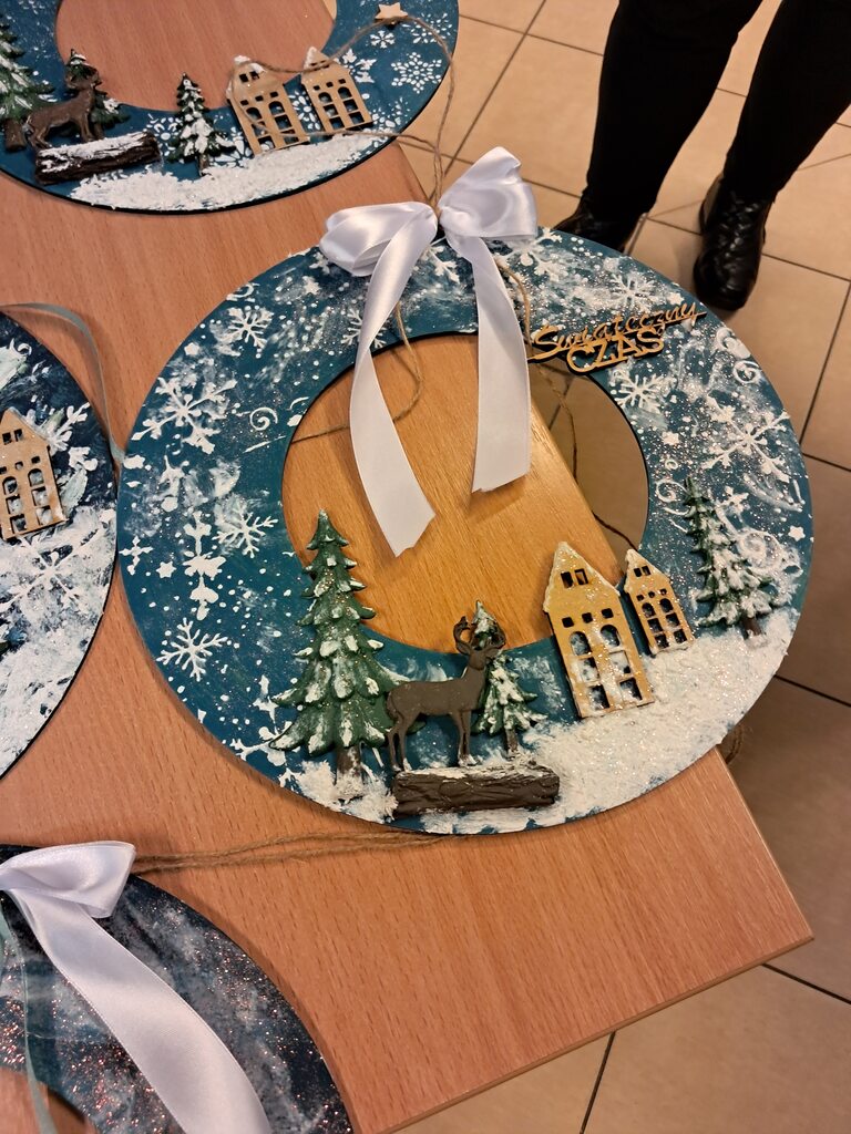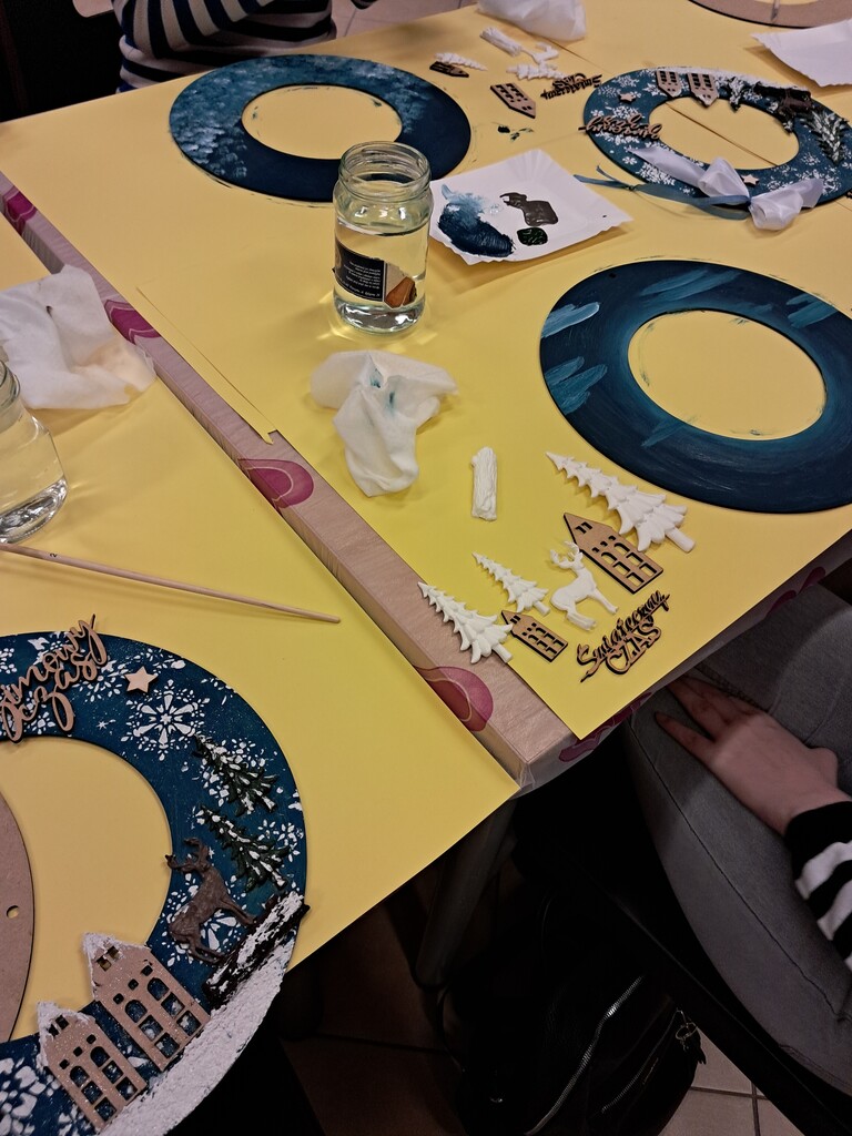 14 grudnia 2023 r. w Wypożyczalni nr 2 odbyły się warsztaty tworzenia wianka bożonarodzeniowego. Podczas zajęć uczestnicy wykonali wianek techniką mix media (technika łączenia różnorodnych materiałów). Bazą wianka była płyta HDF (drewnopodobna) o średnicy 30 cm, która została pomalowana farbą akrylową, a następnie ozdobiona odlewami z masy lekkiej oraz pastą strukturalną. Udało nam się stworzyć wspaniałą ozdobę, która będzie cieszyć oko w tym świątecznym czasie.
