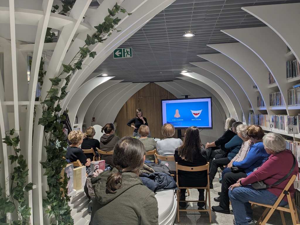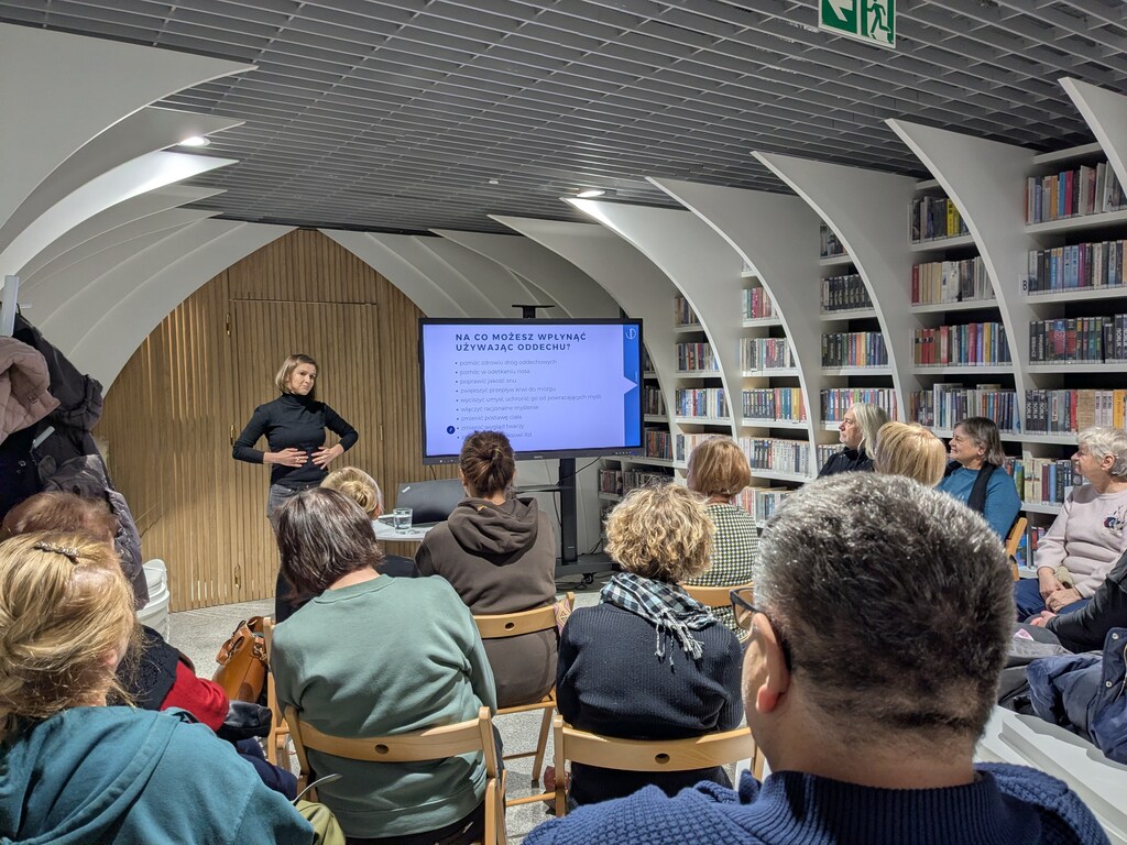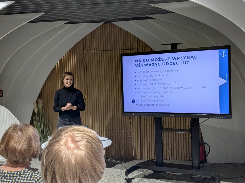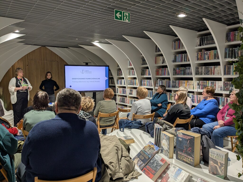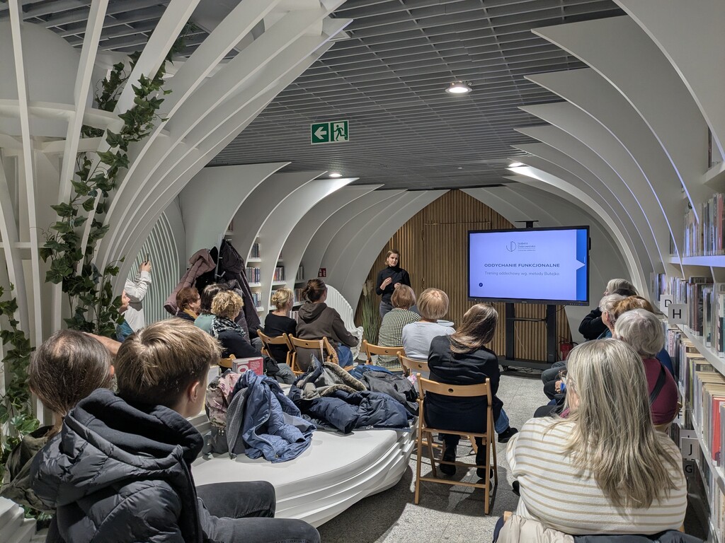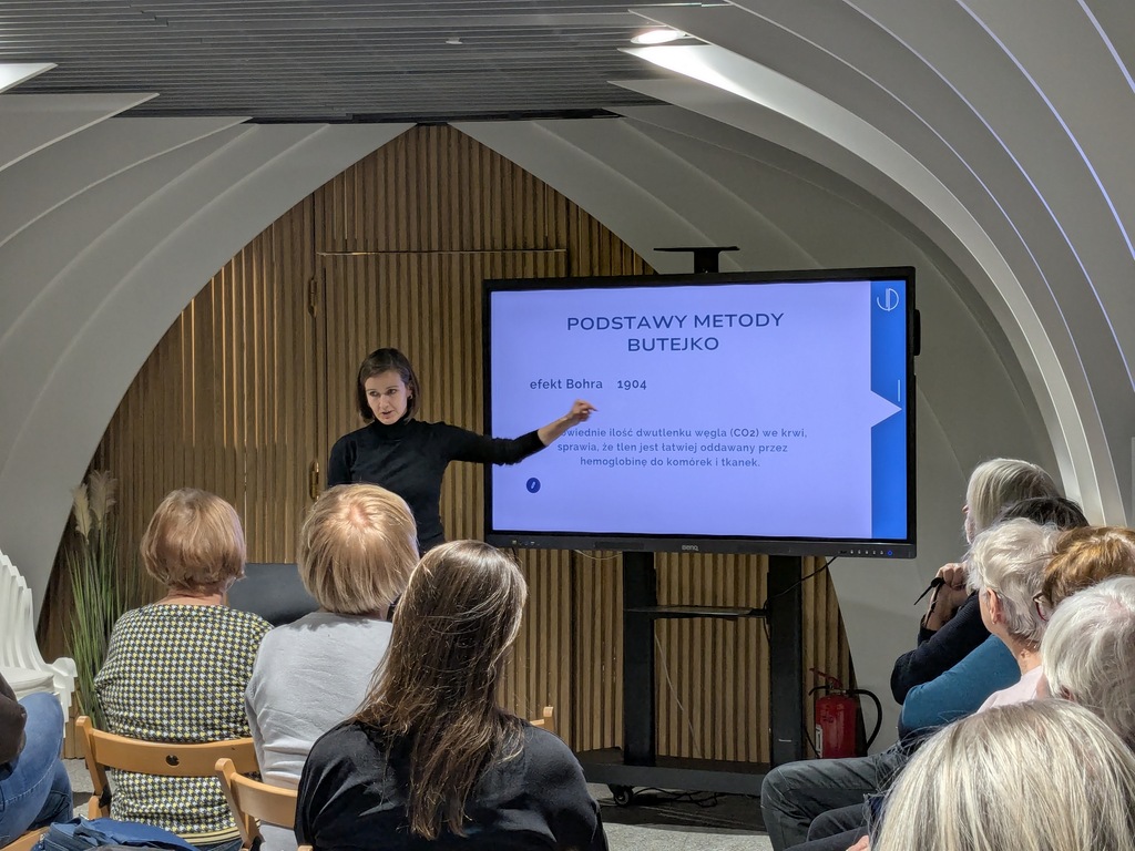Podczas warsztatów Pani Izabela przybliżyła główne założenia metody Butejko. Licznie przybyli uczestnicy wydarzenia wykonywali również ćwiczenia oddechowe.