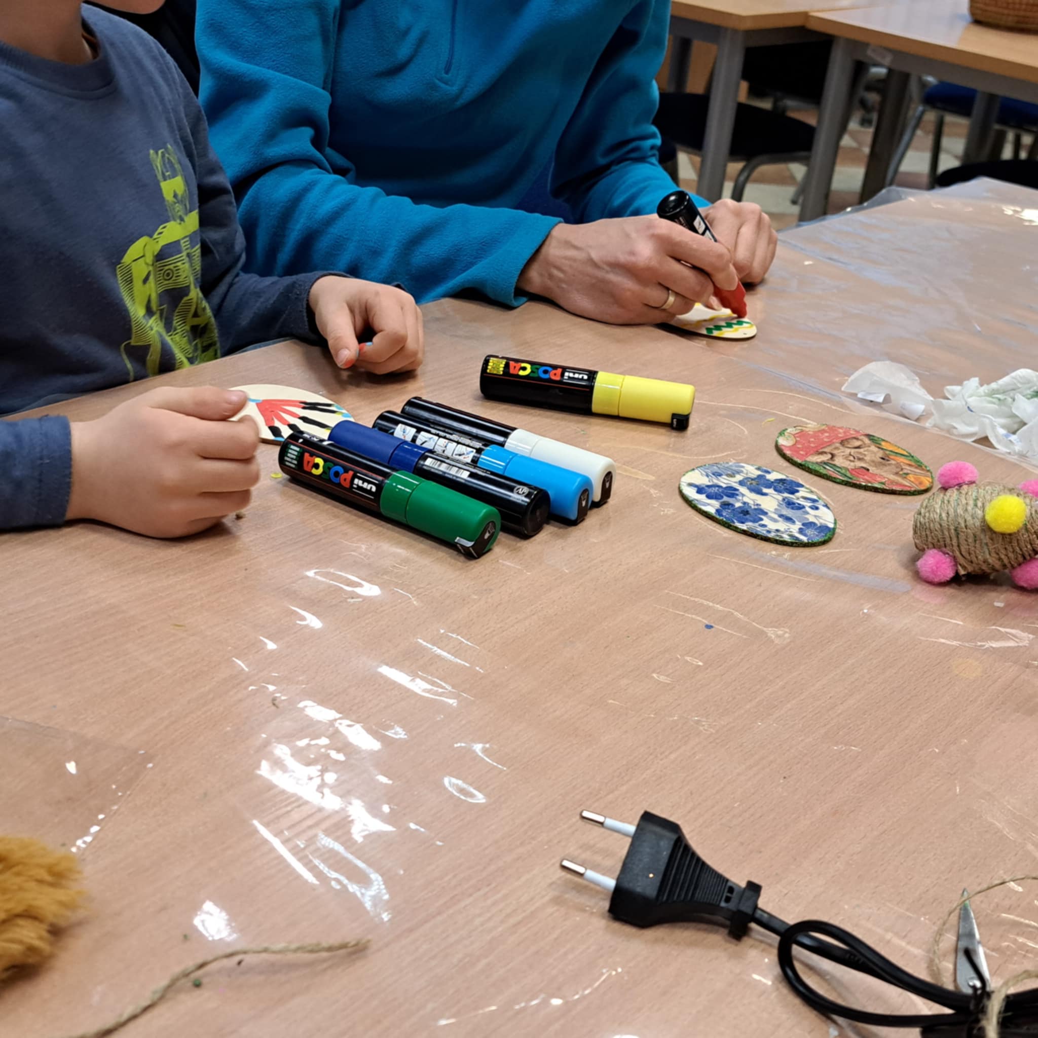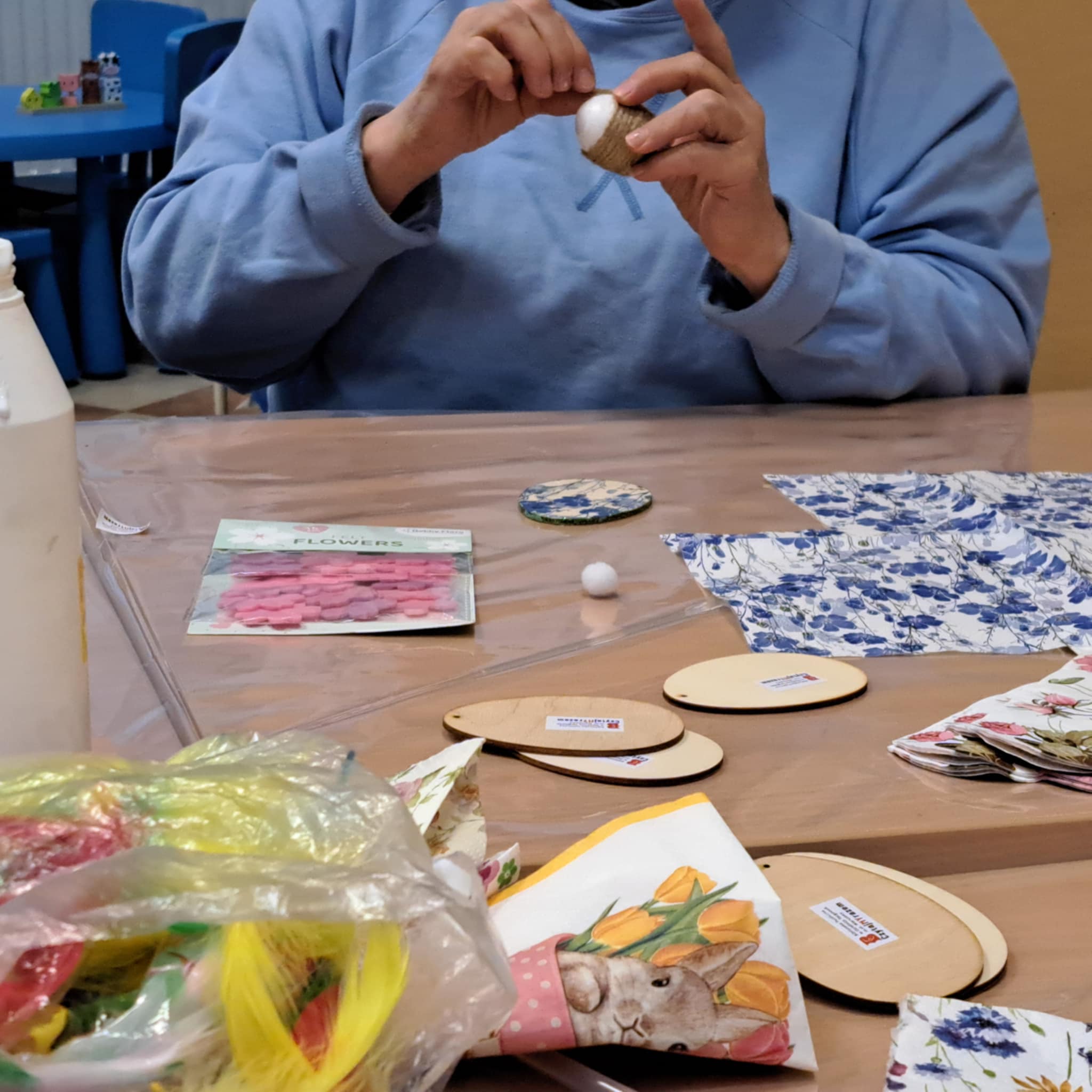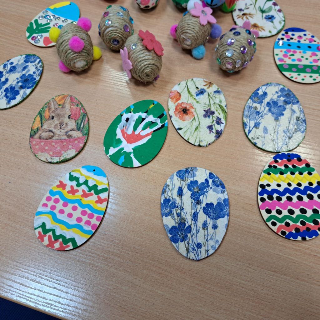 10.04.2025 r. w Bibliotece dla Dzieci i Młodzieży nr 52 (ul. Rembielińska 6A) odbyły się wielkanocne warsztaty plastyczne. Do ozdobienia styropianowych jajek uczestnicy spotkania użyli jutowego sznurka, filcowych kwiatków oraz kryształków. Kolejnym punktem warsztatów było ozdabianie drewnianych jajek metodą decoupage oraz malowanie ich farbami plakatowymi.