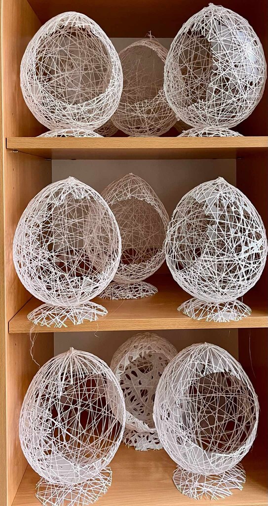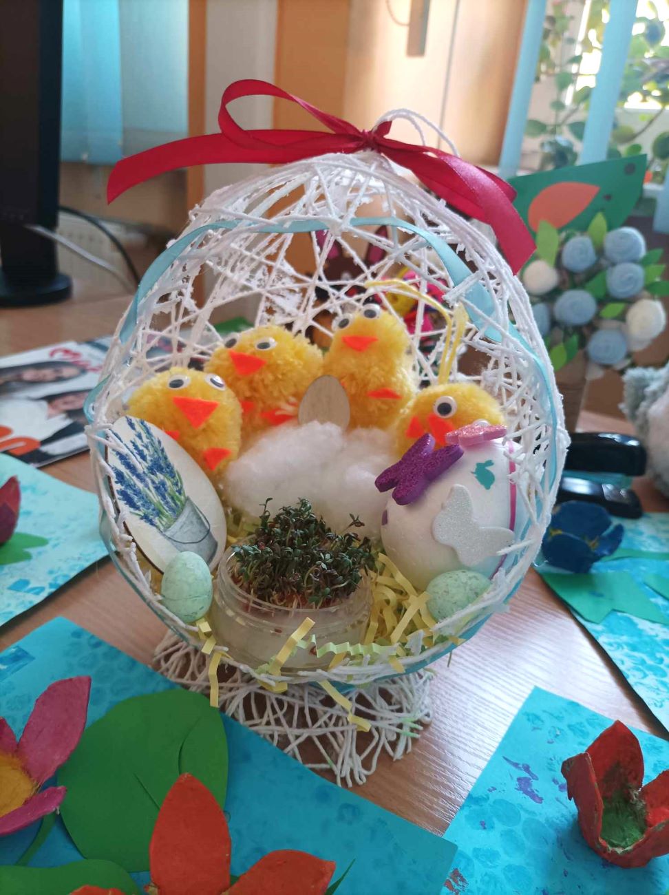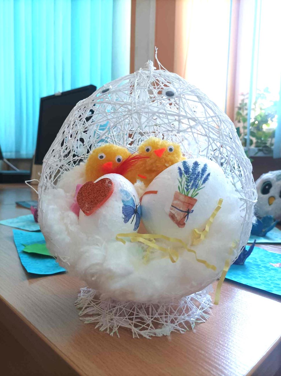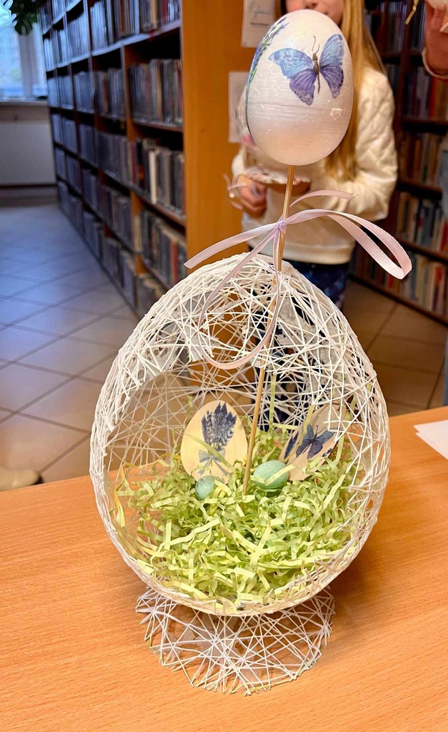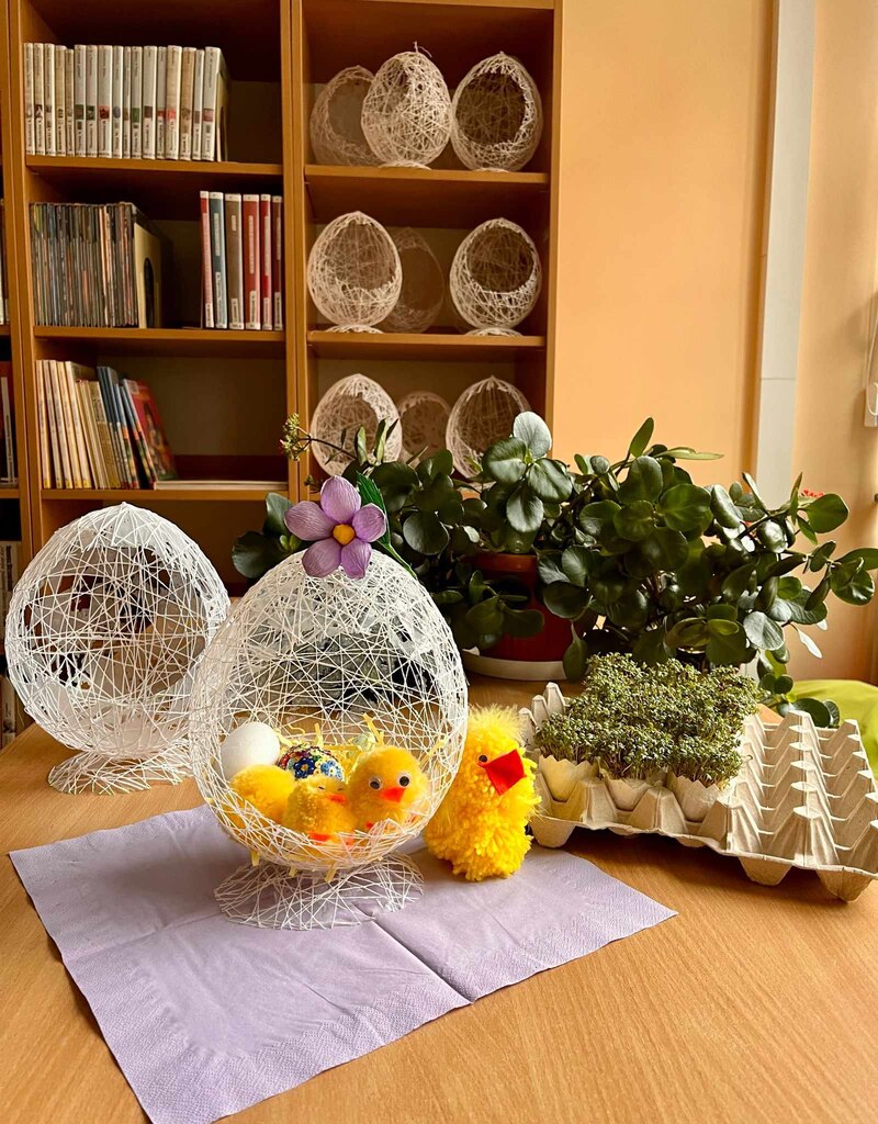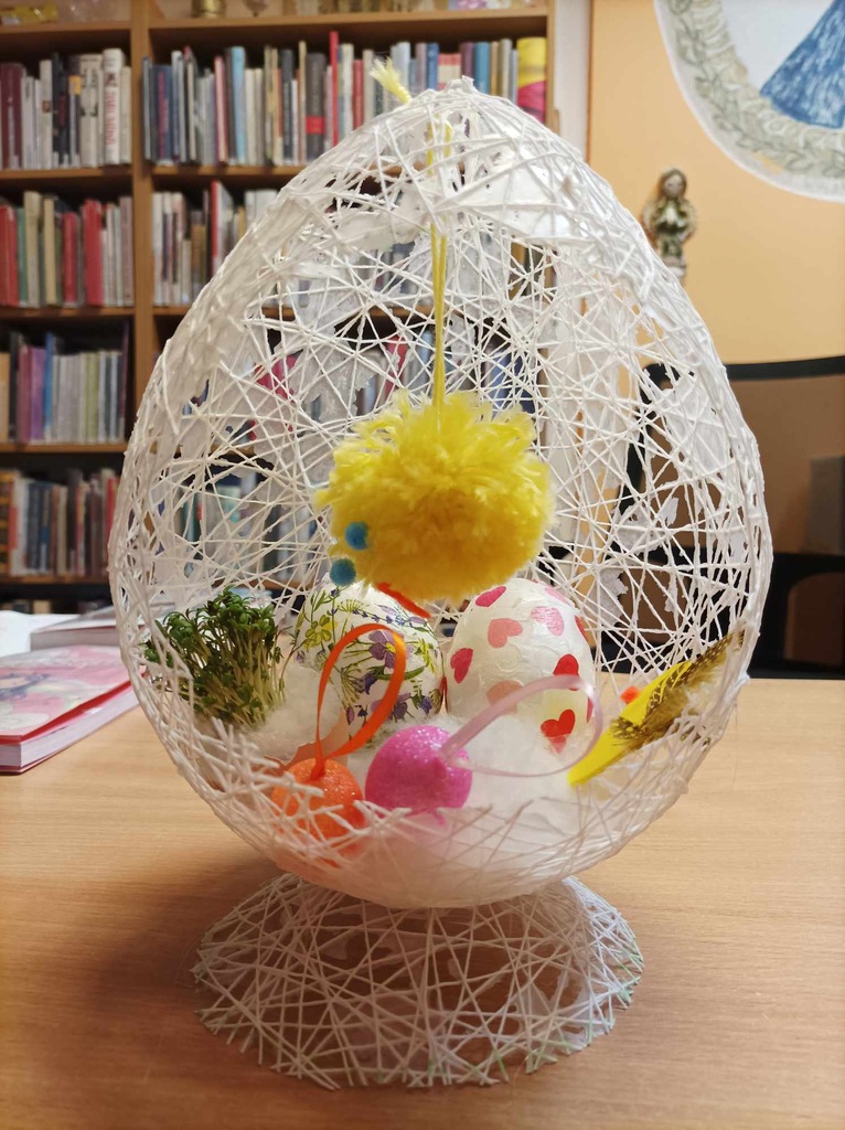 Podczas tegorocznych warsztatów wielkanocnych wykonywaliśmy ozdoby świąteczne do bardzo ładnego i oryginalnego koszyczka wielkanocnego. Koszyk wykonany był ze sznurka pokrytego klejem, który następnie został umieszczony na nadmuchanym balonie. Tak powstała bardzo ciekawa forma, w której po przebiciu balonika wycięty został otwór. Do środka koszyczka uczestnicy warsztatów wkładali własnoręcznie wykonane elementy ozdobione wybraną techniką, styropianowe jajko i kurczaczek z włóczki.