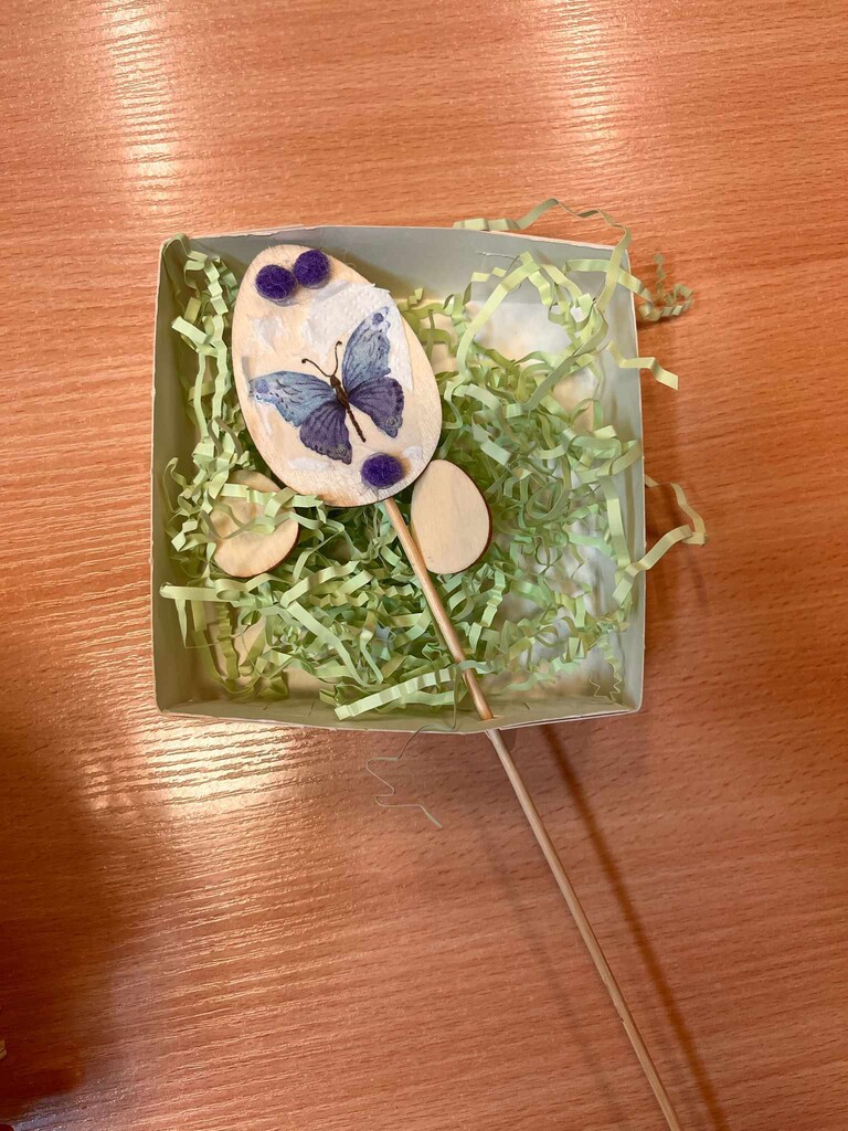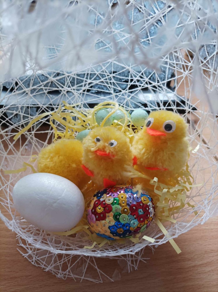 Pisanki były ozdabiane metodą decoupage, zwiniętą w sznureczek bibułką, naklejkami i piórkami. Kurczaka z włóczki wykonaliśmy metodą tradycyjną, czyli nawinęliśmy na dwa wycięte z kartonu kółeczka, które miały w środku otwór, żółtą włóczkę, a następnie odpowiednio ją przecięliśmy i uformowaliśmy żółtą kuleczkę – kurczaka.