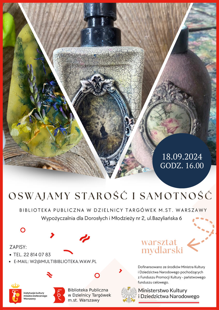 Serdecznie zapraszamy na warsztat mydlarski w ramach projektu „Oswajamy starość i samotność” wspieranego przez Ministerstwo Kultury i Dziedzictwa Narodowego.