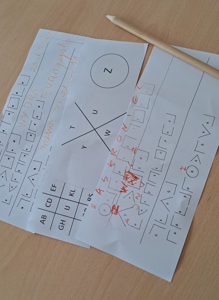 Dla relaksu rozwiązaliśmy później zaszyfrowaną łamigłówkę. Działając w zespołach, z kluczem deszyfrującym w dłoni odgadywaliśmy nazwy zwierząt z tekstu – wcale nie takie łatwe! A trud został nagrodzony – każdy uczeń wylosował znaczek ze zwierzęciem, nikt nie został pominięty, a wizerunek zaskrońca, błotniaka stawowego czy rusałki admirała stanowił miłą pamiątkę ze wspólnych zajęć.