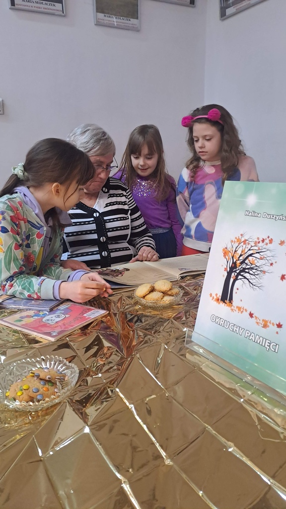Poruszyliśmy też temat autobiografii pisanej przez seniorów. Doskonałym przykładem okazała się książka pani Haliny Duszyńskiej – biologa, wieloletniej zasłużonej nauczycielki w szkole podstawowej, która postanowiła, będąc w cudownie złotym wieku, opisać całe swoje życie na kartach książki „Okruchy pamięci”. Zarówno dzieci, jak i dorośli biorący udział w spotkaniu mieli okazję zapoznać się z książką, którą można wypożyczyć z naszej biblioteki. Przywołanie wspomnień pani Haliny Duszyńskiej było znakomitym zwieńczeniem Tygodnia Międzypokoleniowego w Wypożyczalni dla Dorosłych i Młodzieży nr 98 oraz dowodem na to, że każdy wiek może być złoty.