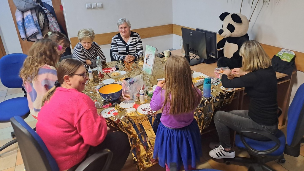 Na złote spotkanie międzypokoleniowe w dniu 24 kwietnia zaprosiliśmy seniorów oraz dzieci. Wspólnie czytaliśmy książki i wykonaliśmy prace plastyczne. Ponieważ tegoroczna akcja obchodzona jest pod hasłem „Każdy wiek może być złoty”, to właśnie złoto było kolorem dominującym w naszym spotkaniu. Począwszy od stołu nakrytego złotym obrusem, po złote cekiny, które dzieci przyklejały do złotych medali, trafiających następnie na piersi seniorów, ale… nie tylko!