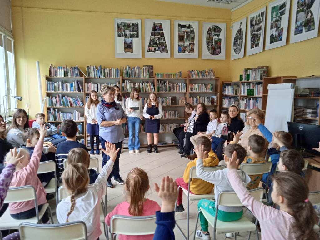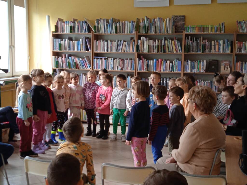 Uczniowie zaprezentowali swoje talenty wokalne. Koncert bardzo się dzieciom spodobał, a po chwili… również i one wystąpiły na bibliotecznej scenie. Zwieńczeniem wydarzenia było wspólne wykonanie na bis jednego z utworów. Muzyczne połączenie kilkulatków z kilkunastolatkami wywołało gromkie owacje.