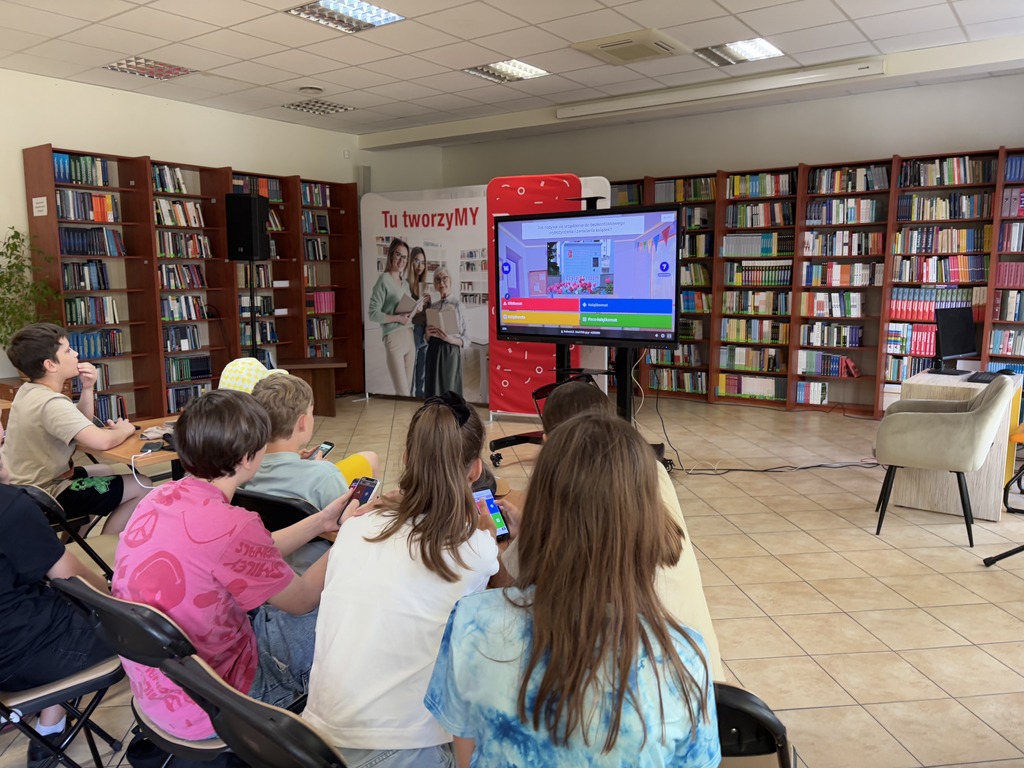 Na zakończenie poznaliśmy zwycięzców quizu. Trzy osoby dostały nagrody w postaci książki. Była to zacięta rywalizacja. Do końca nie wiedzieliśmy, kto wygra. Poza tym rozwiązaliśmy wspólnie krzyżówkę – młodzież z zaciekawieniem podchodziła do ekranu multimedialnego. Na koniec wyruszyliśmy do książkomatu, aby każdy mógł odebrać dla siebie mały upominek od Biblioteki.