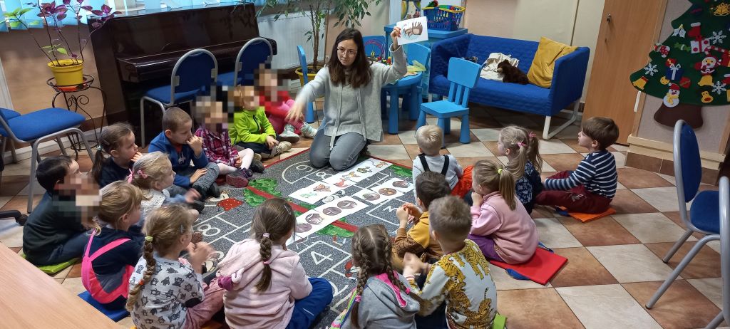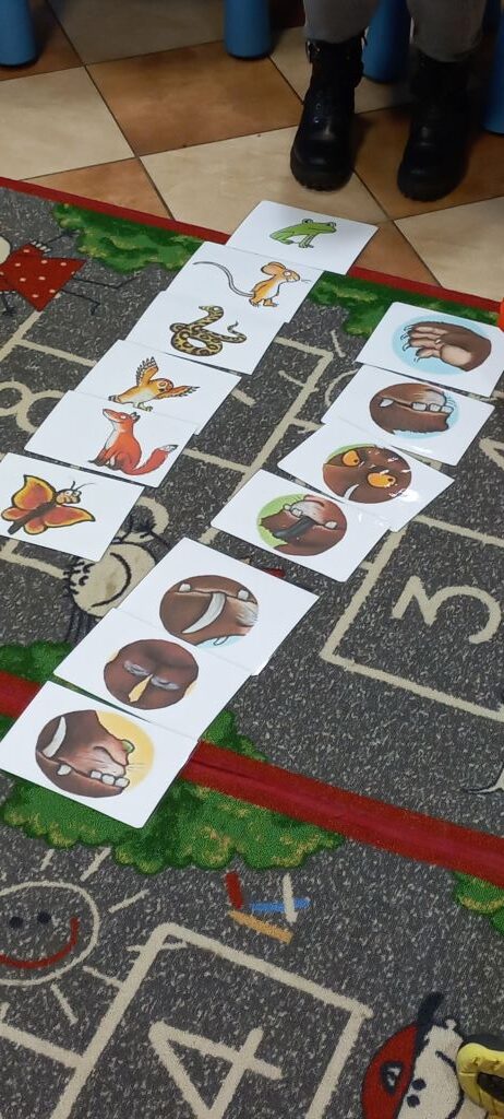 14 grudnia 2023 r. w Bibliotece dla Dzieci i Młodzieży nr 52 odbyło się spotkanie w ramach wydarzenia „Czytanie na dywanie” organizowane przez szkołę języka angielskiego Early Stage. Lektorka – Pani Karolina spotkała się ponownie z grupą Muminki z przedszkola nr 156. Zanim dzieci wysłuchały książki pt. „The Gruffalo” Julii Donaldson w wersji oryginalnej, Pani Karolina nauczyła dzieci kilku nowych słówek związanych z wyglądem głównego bohatera opowiadania. Znajomość nowych wyrazów przedszkolaki mogły przećwiczyć w zabawie na czas w dwóch grupach.