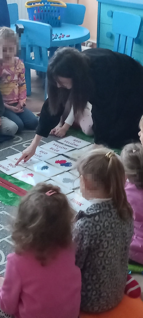 Rytmiczne nazywanie kolorów po angielsku bardzo spodobało się przedszkolakom. Jednym z zadań dzieci było łączenie kolorowych plastelin i powiedzenie, jaki nowy odcień powstał. Na zakończenie pani Karolina przeczytała książkę pt. „Blue Chameleon” Emily Gravett, by dzieci utrwaliły angielskie nazwy barw i kolorów.