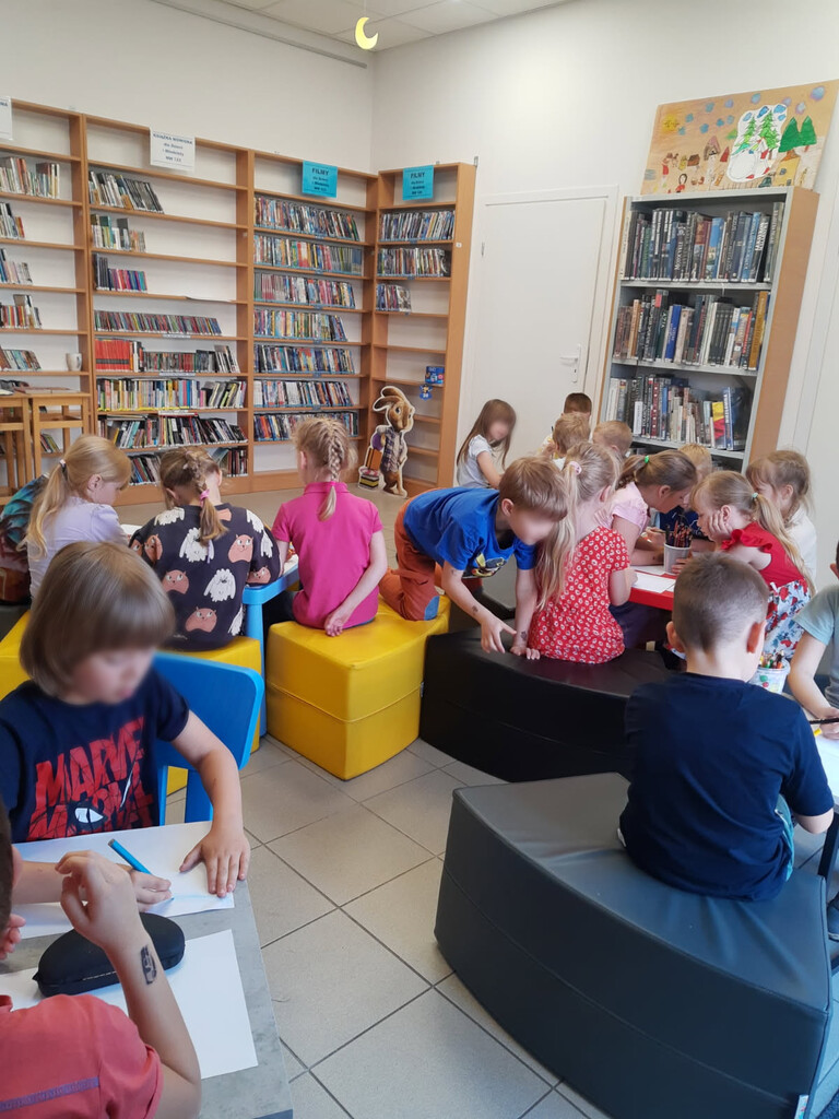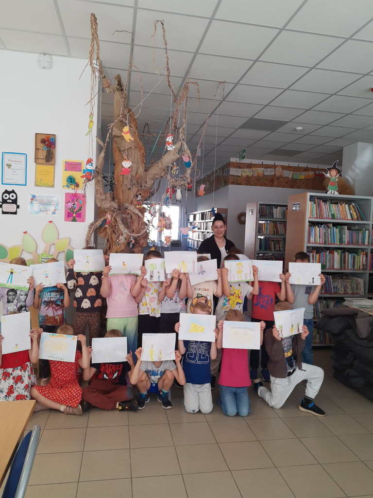 Kolejnym etapem była próba narysowania Leśnego Echa. Dzieci zaskakiwały swoją inwencją twórczą. W niektórych pracach zaistniały nawet elementy zapisu muzyki w postaci nutek. Na koniec zajęć odbyła się generalna próba „bibliotecznej filharmonii”, podczas której dzieci odtworzyły dźwięki padającego deszczu, szumiącego wiatru oraz innych dźwięków natury, a to wszystko złożyło się w muzykę. Zajęcia zwieńczyło wspólne zdjęcie wraz z pracami plastycznymi.